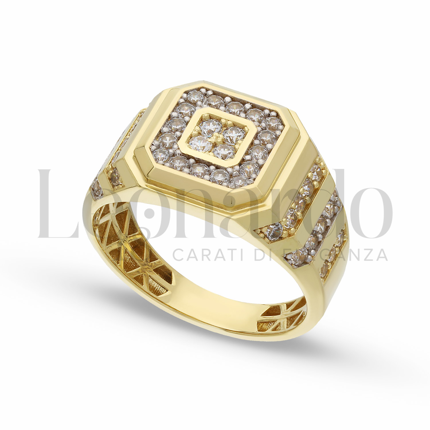 Anello da Uomo, di forma ottagonale, con Pavè di Zirconi Bianchi, lavorazione 3D, finitura lucida in Oro Giallo e Oro Bianco.
