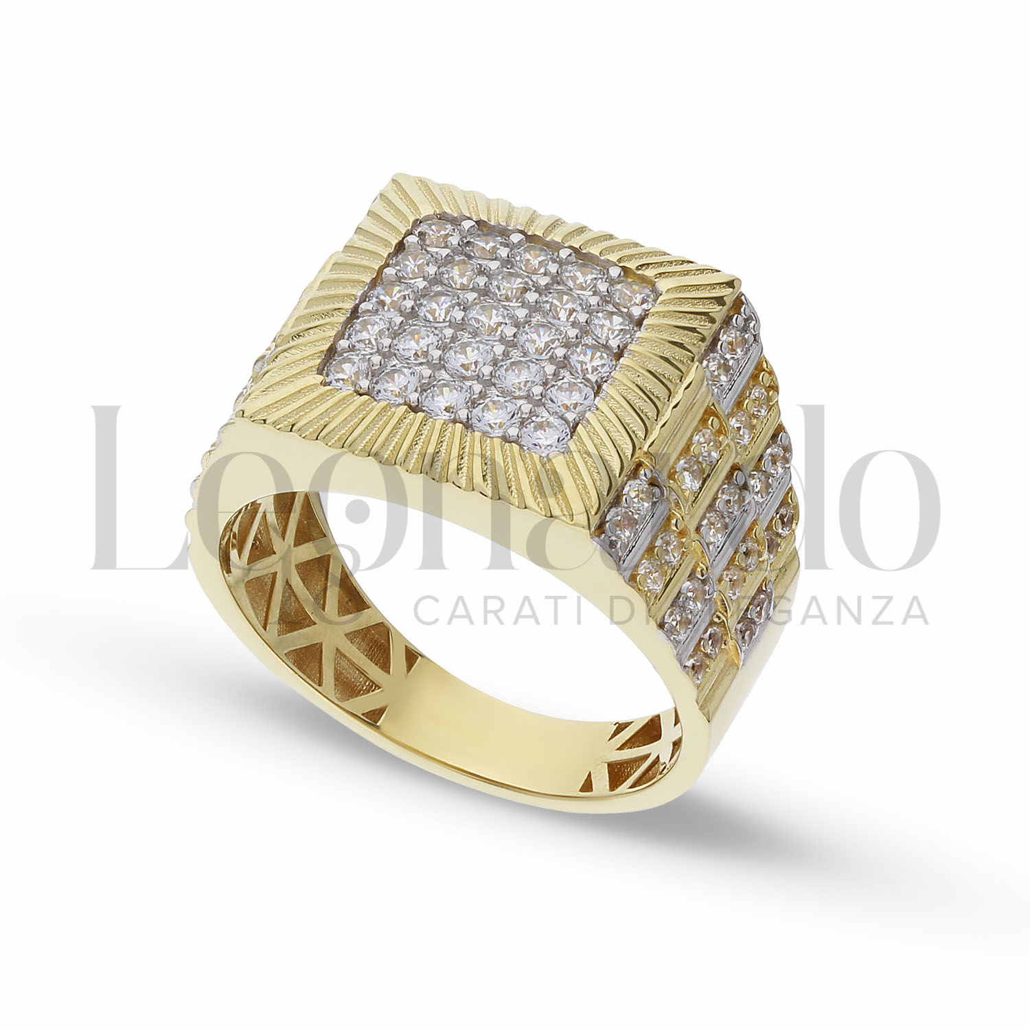 Anello da Uomo, realizzato in 3D, finitura lucida, forma quadrata con pavè di zirconi bianchi, in Oro Giallo e Oro Bianco.