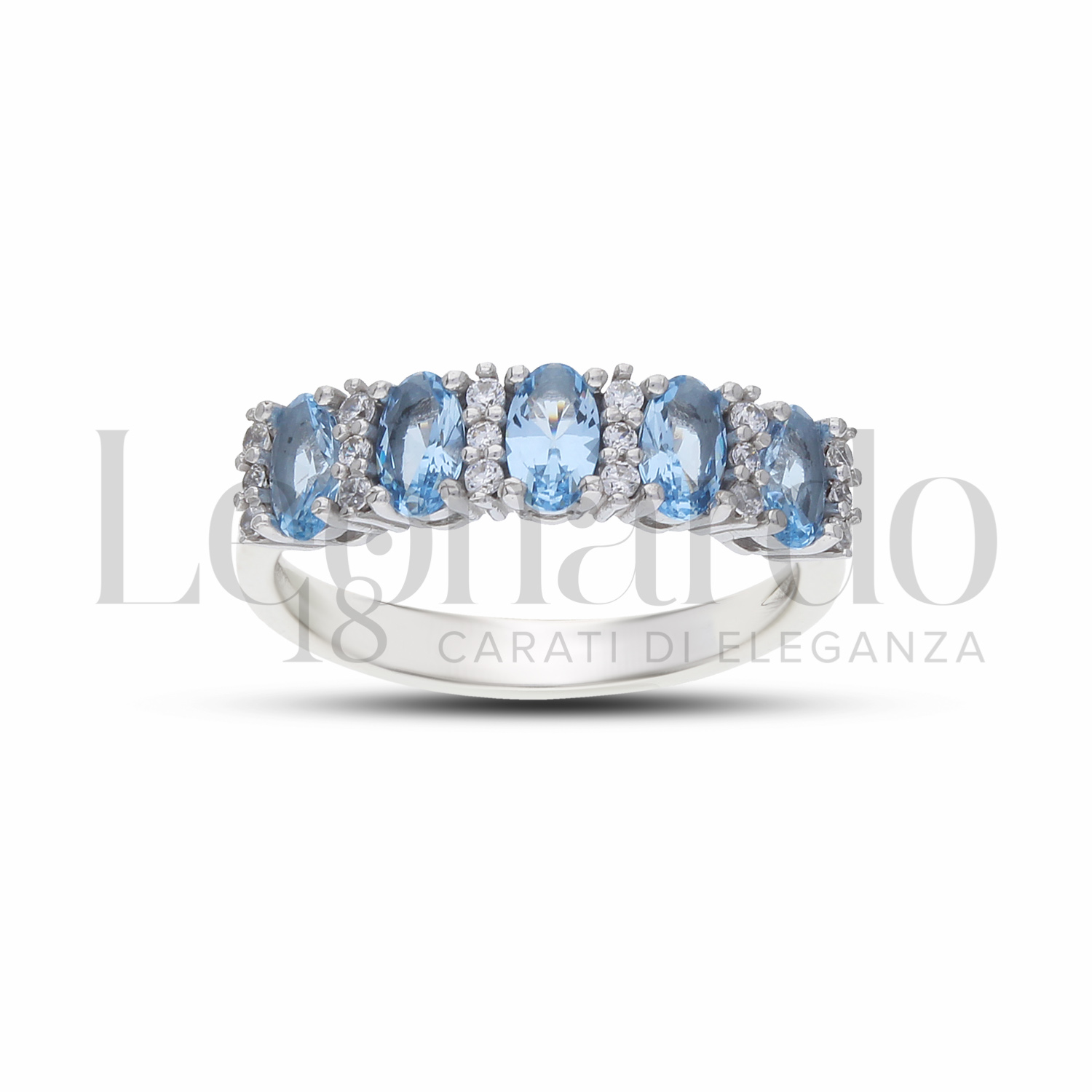Anello da Donna, con cinque Pietre Ovale di Colore Topazio Azzurro e Zirconi Bianchi, in Oro Bianco.