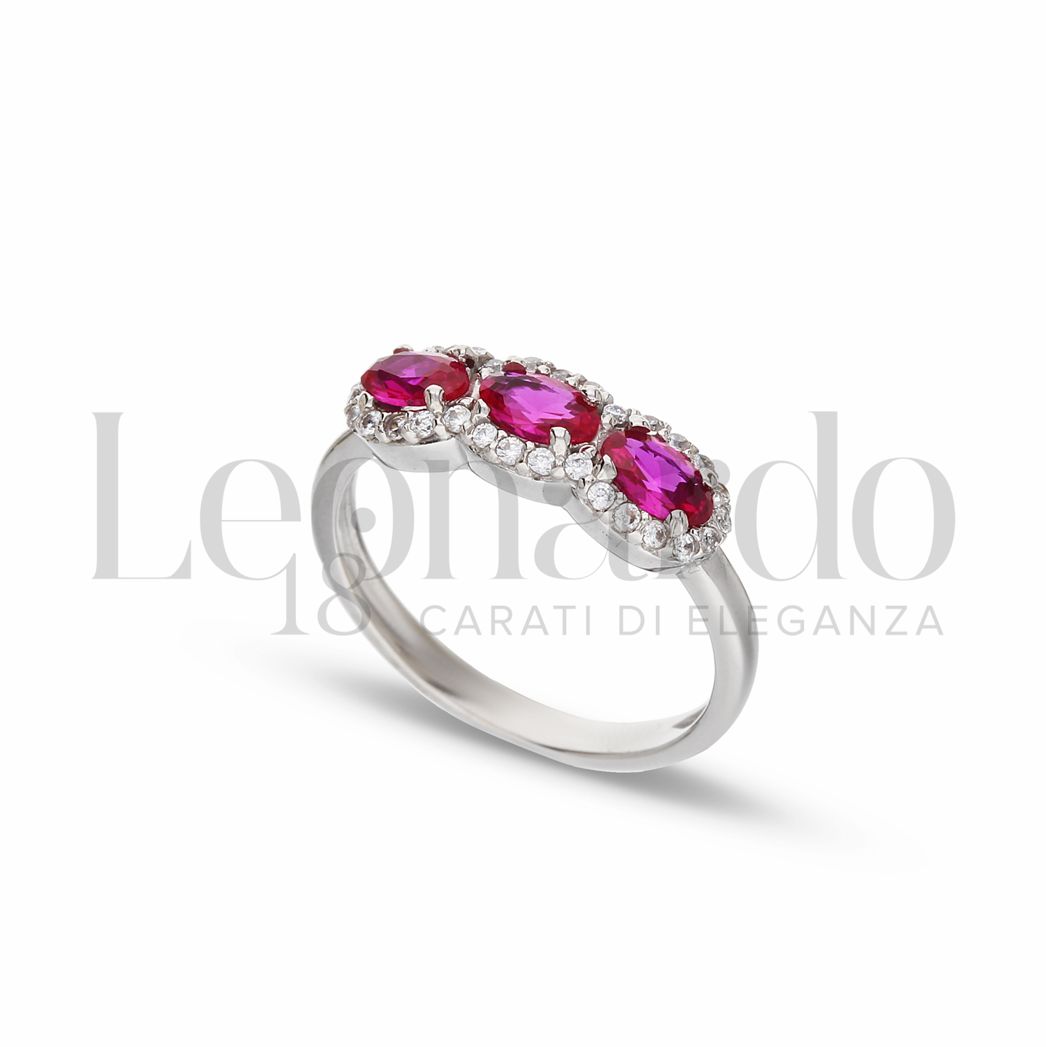 Anello da Donna con 3 pietre ovali rosse orizzontali e zirconi bianchi in Oro Bianco.