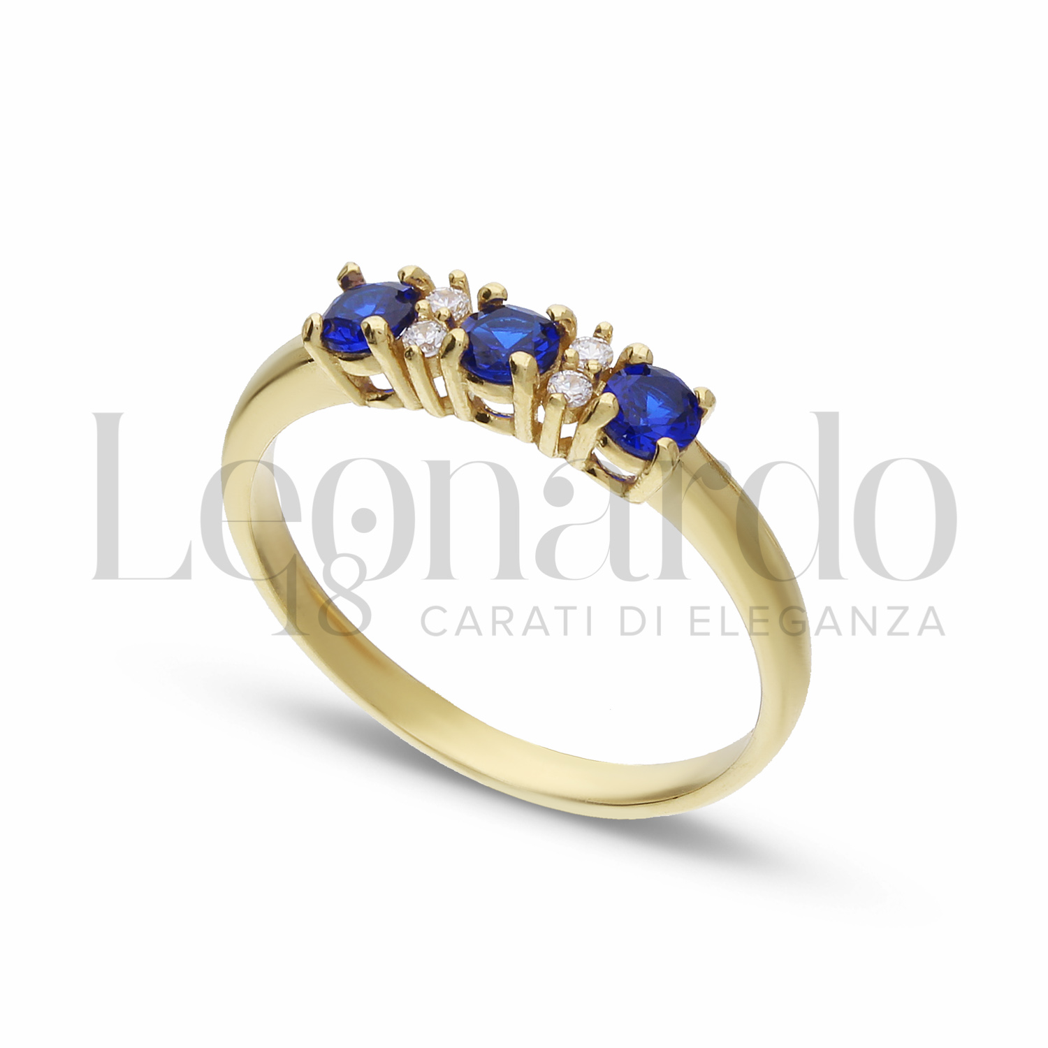 Anello da Donna, con pietre Blu di forma tonda e zirconi bianchi, modello Trilogy in Oro Giallo.