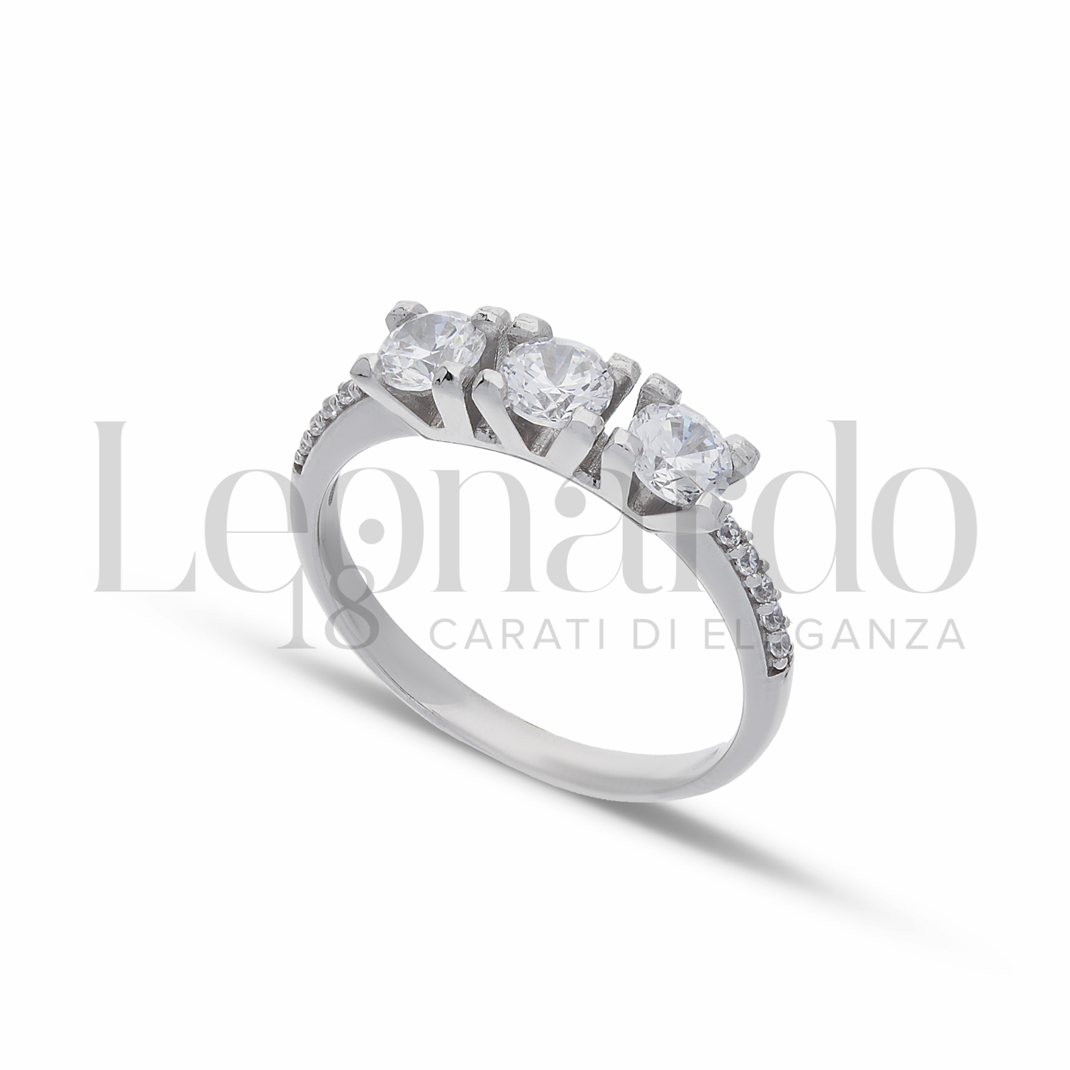 Anello Trilogy da Donna, con Zirconi da 4 mm, e Pietre sul Gambo in Oro Bianco