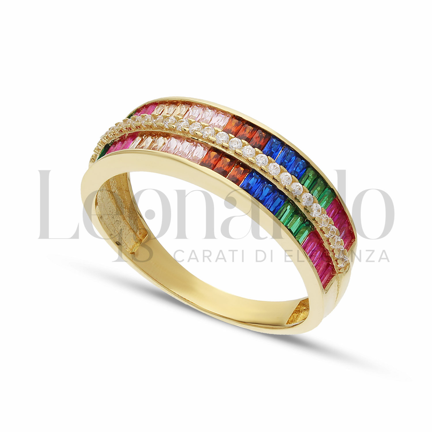 Anello Mezza Veretta da Donna, con Zirconi Rainbow, taglio Baguette, in Oro Giallo.