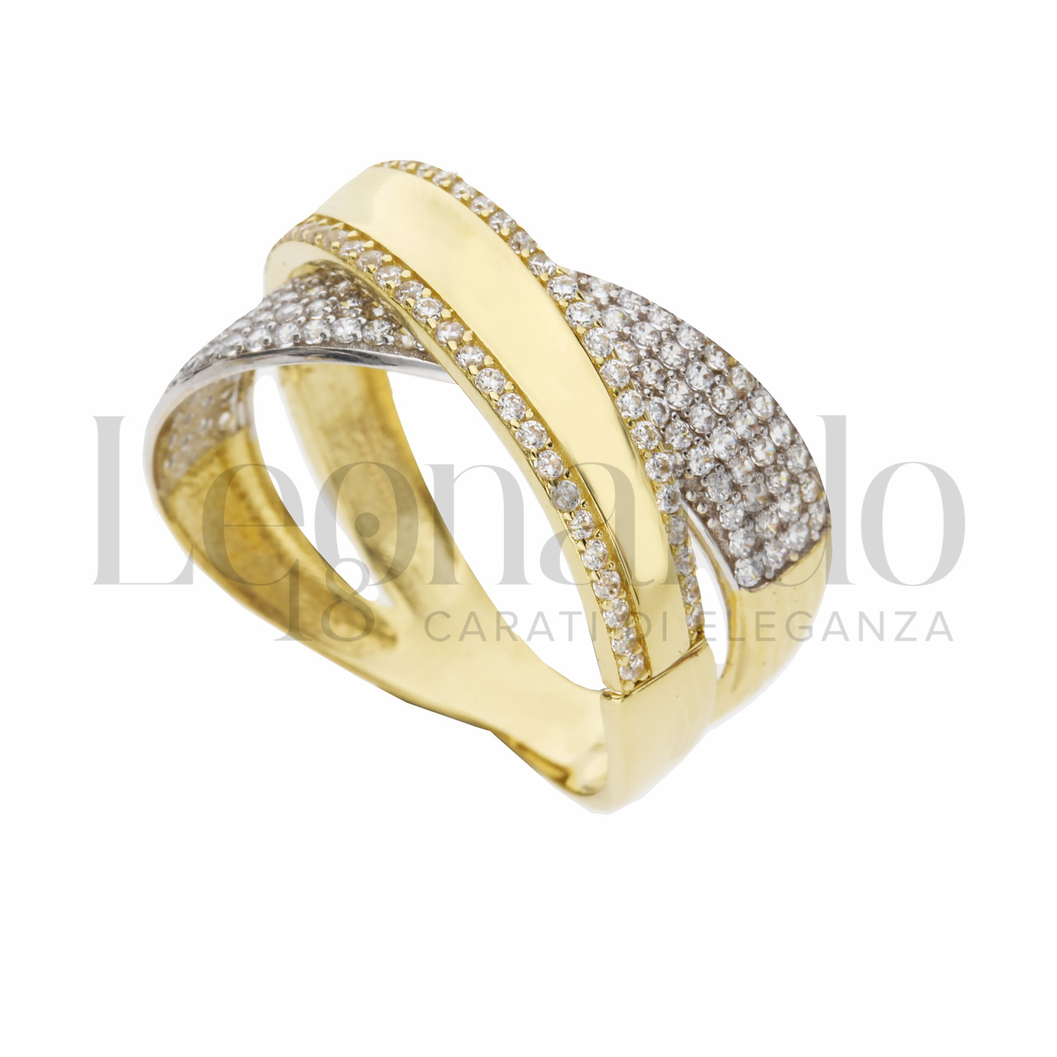 Anello da Donna, a fascia intrecciata, con zirconi bianchi in Oro Giallo e Oro Bianco.
