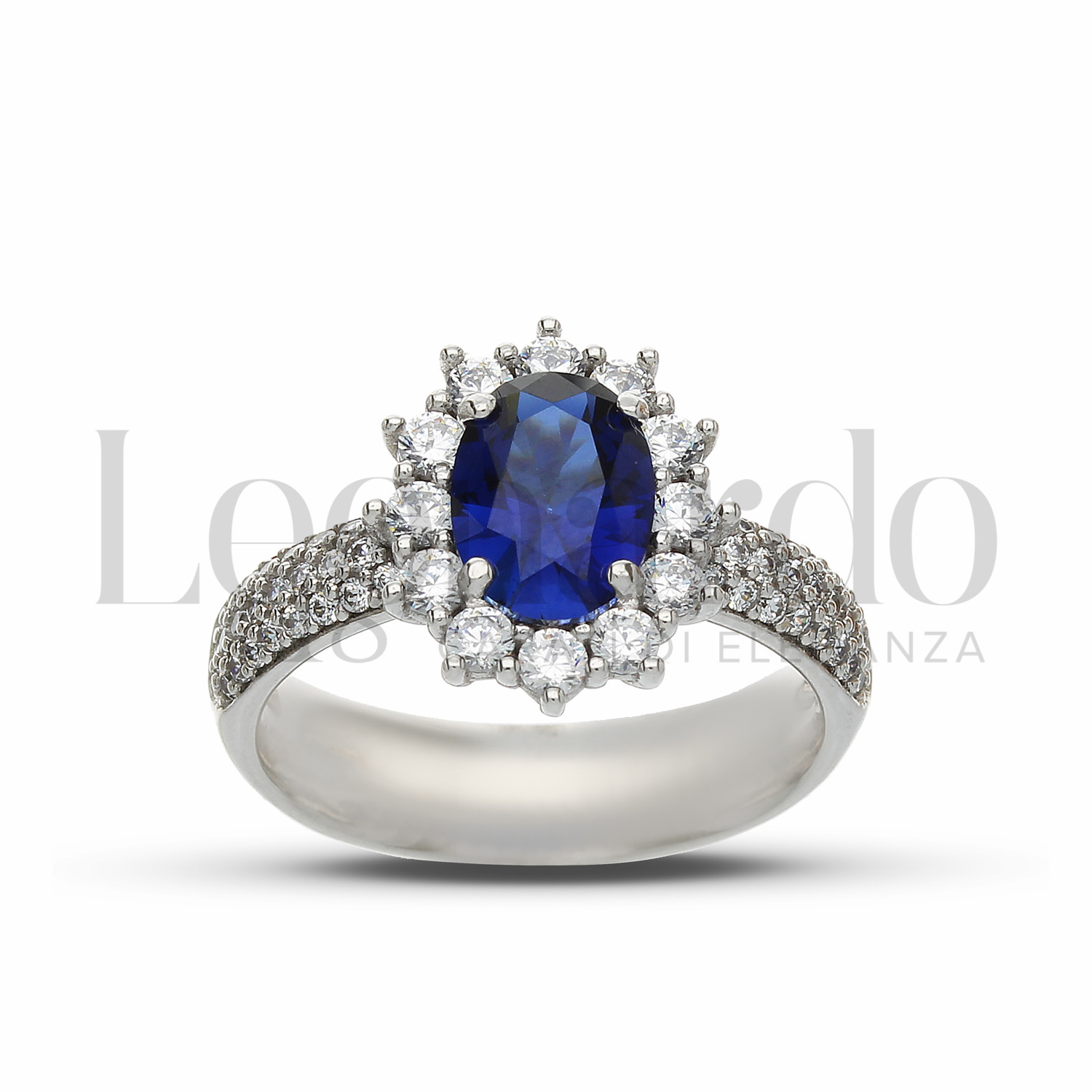 Anello da Donna, modello Kate 2° misura con zirconi sul gambo e pietra blu, in Oro Bianco.