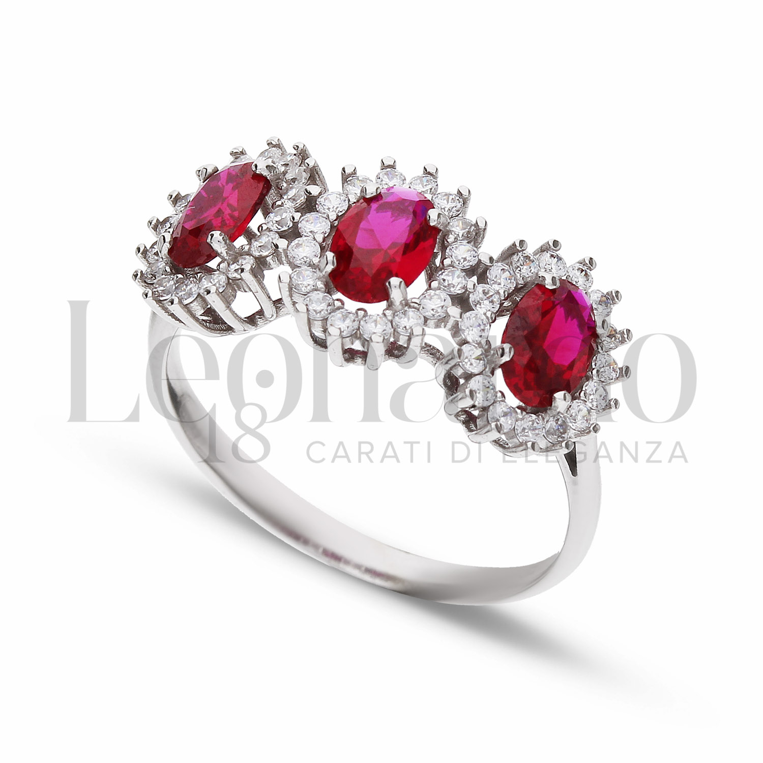 Anello Trilogy da Donna, modello Kate 1° misura, con pietre di colore rosso contornate da una fila di zirconi bianchi, in Oro Bianco.
