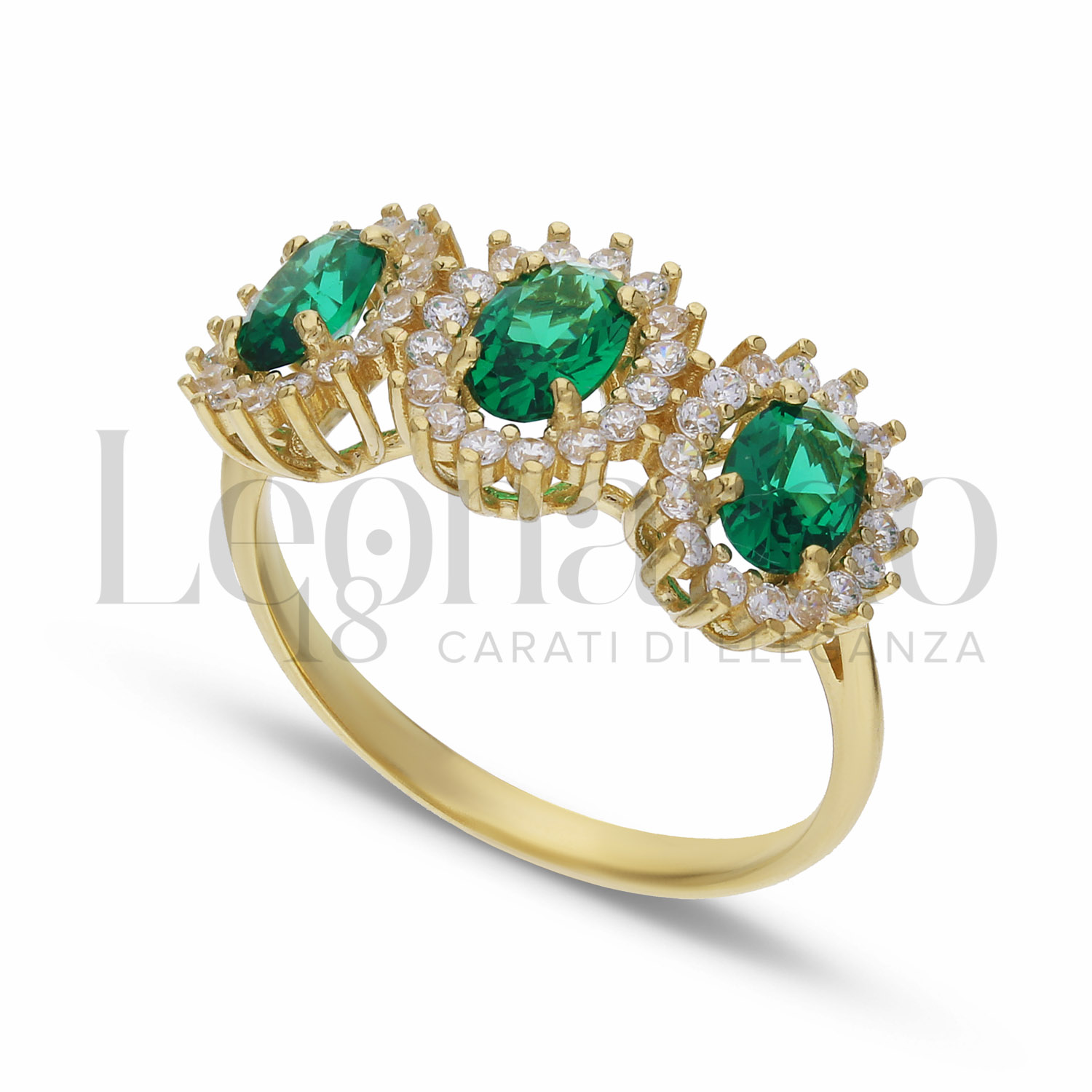 Anello Trilogy da Donna, modello Kate 1° misura, con pietre di colore verde contornate da una fila di zirconi bianchi, in Oro Giallo.