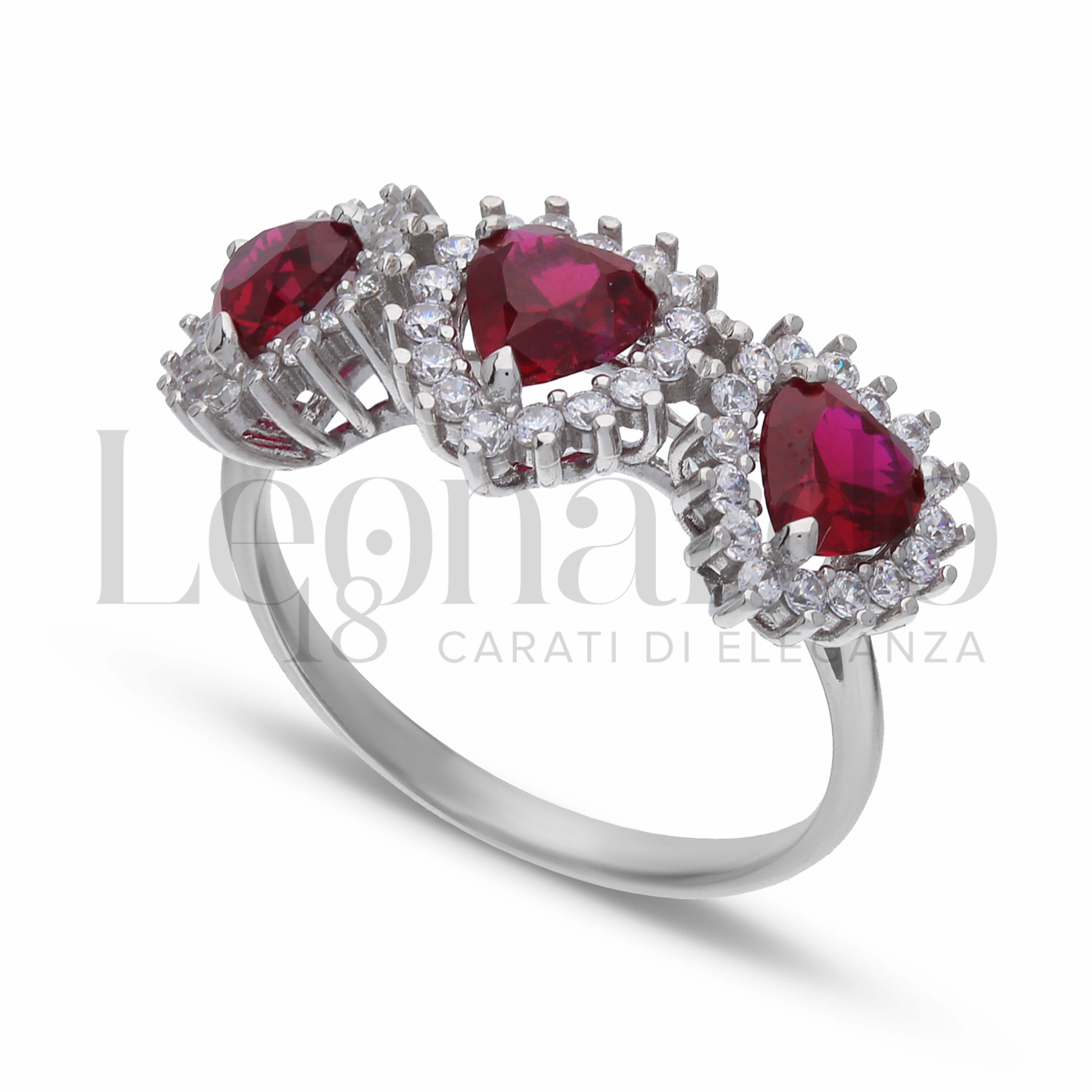 Anello Trilogy da Donna, modello Kate 1° misura, con pietre di colore rosso, forma di cuore, contornate da una fila di zirconi bianchi, in Oro Bianco.