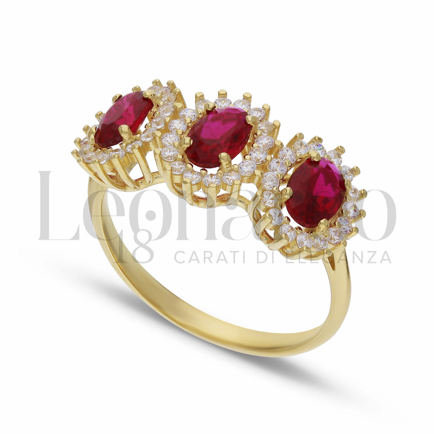 Anello Trilogy da Donna, modello Kate 1° misura, con pietre di colore rosso contornate da una fila di zirconi bianchi, in Oro Giallo.