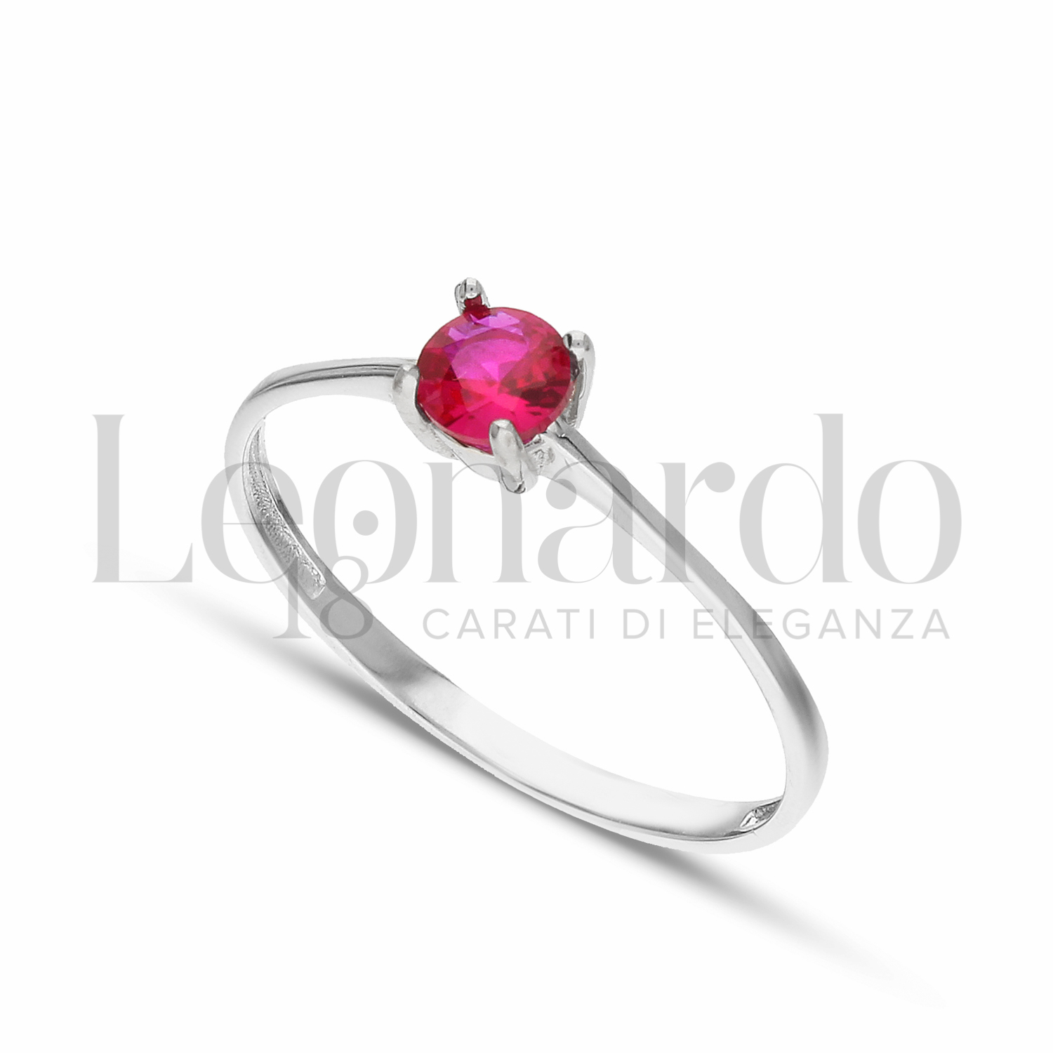 Anello Solitario da Donna, a 4 griffe, con zircone rosso da 4 mm, in Oro Bianco.