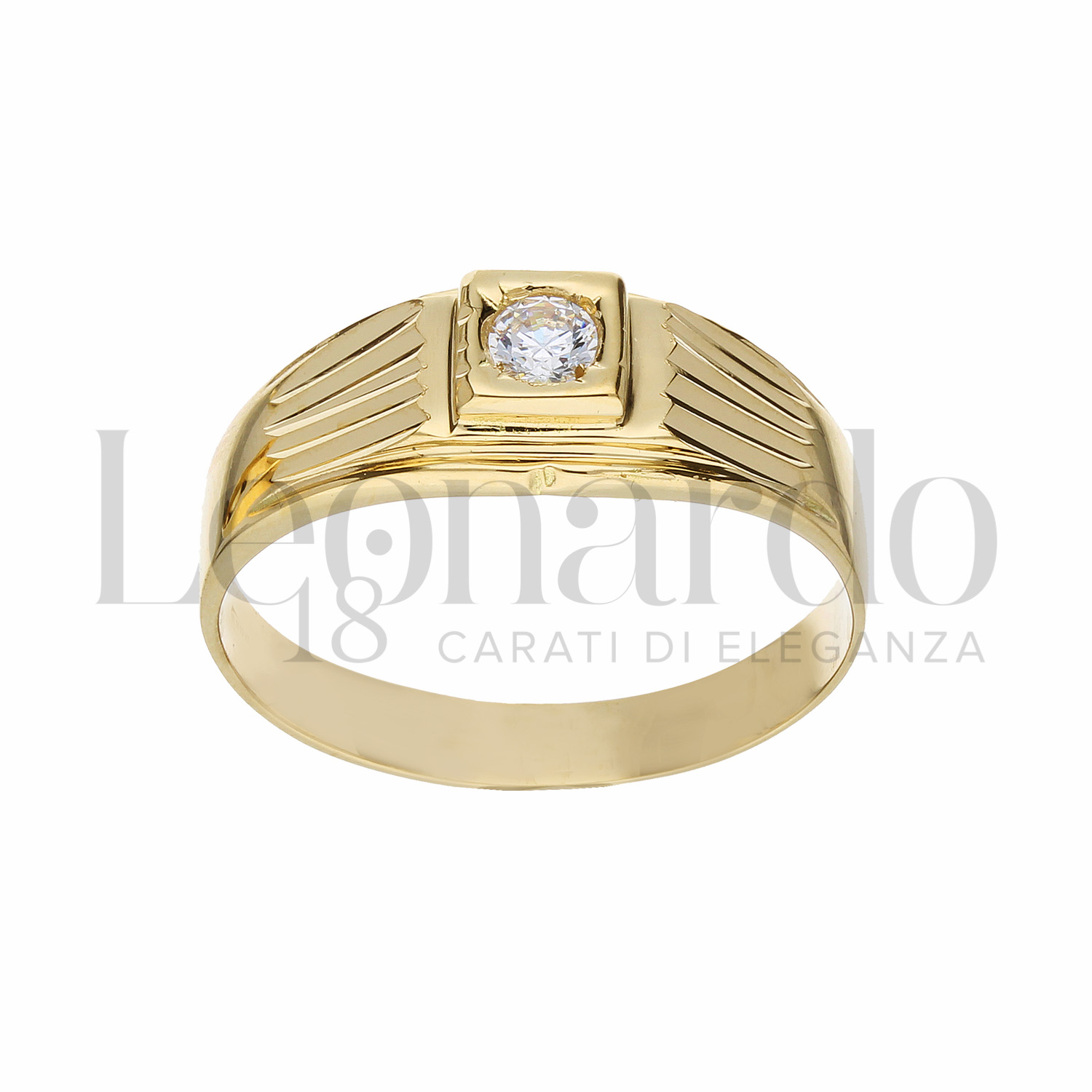 Anello solitario da Uomo, modello battuto, finitura diamantata a strisce, in Oro Giallo.