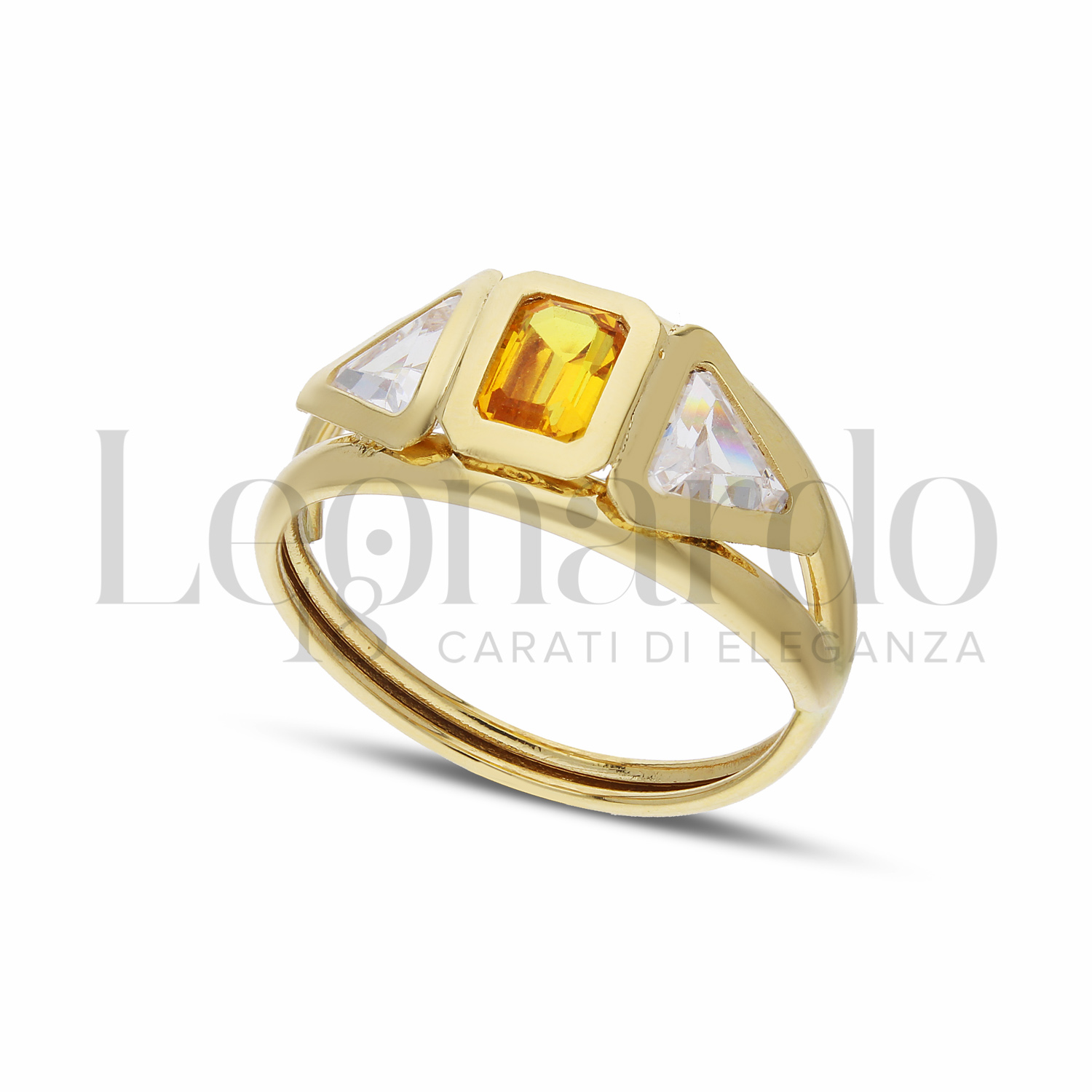 Anello da Donna, Vintage Collection con Pietra Centrale Rettangolare e Zirconi Triangolari Bianchi in Oro Giallo.