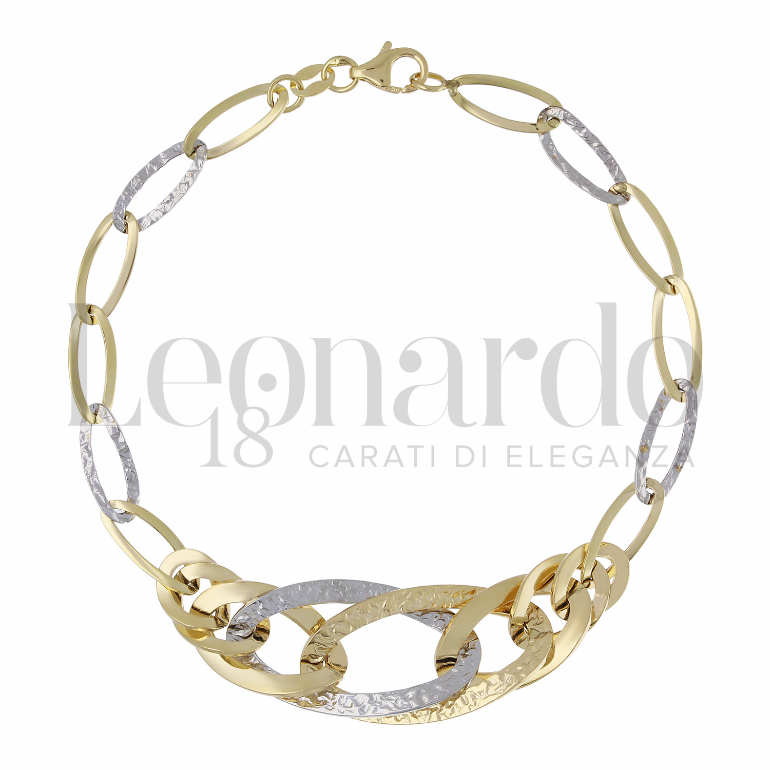 Bracciale a Catena da Donna, modello a scalare, finitura Lucida e Martellata, in Oro Giallo e Oro Bianco.