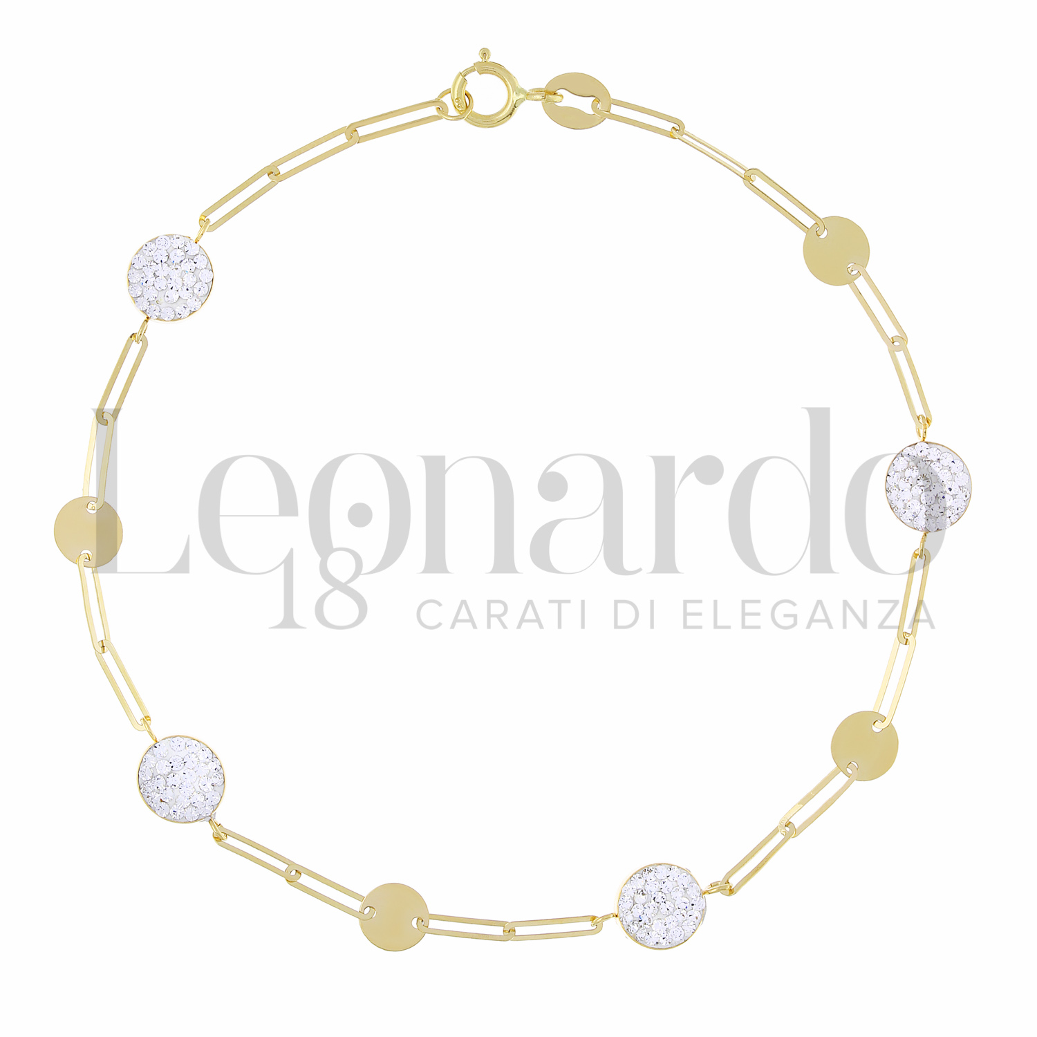 Bracciale a Catena da Donna, Modello Maglia Gucci, con elementi Tondi in linea, in resina e zirconi e a lastra, in Oro Giallo.