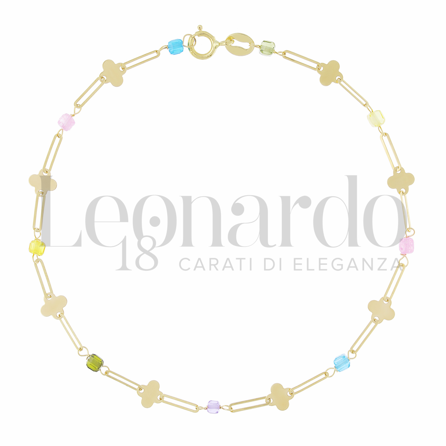 Bracciale a Catena da Donna, Modello Maglia Gucci, con Pietre Colorate e elementi in linea a lastra, Quadrifoglio, in Oro Giallo.
