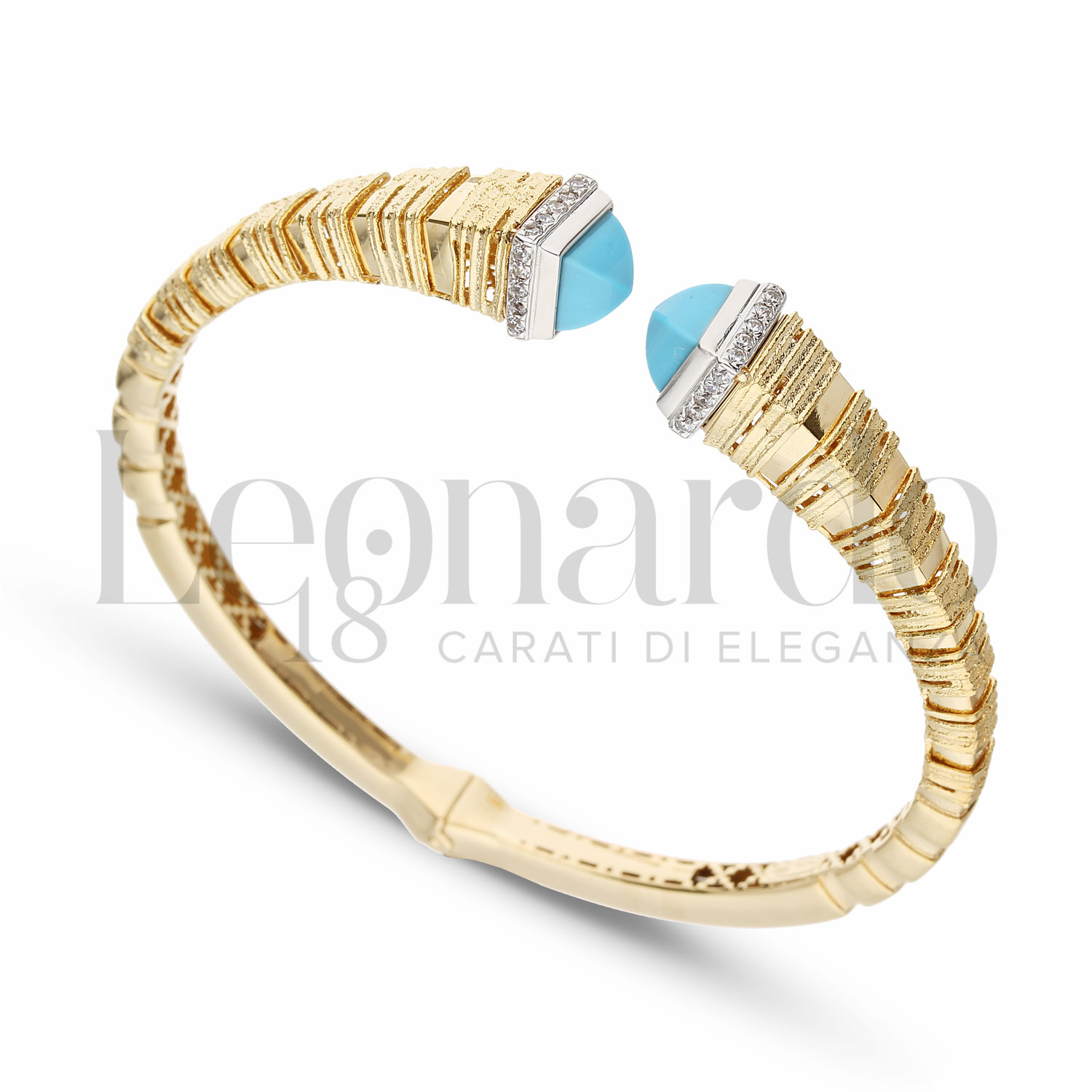 Bracciale Rigido Collezione Double Stone, finitura lucida e satinata, con turchese e zirconi bianchi, in Oro Giallo e Oro Bianco.