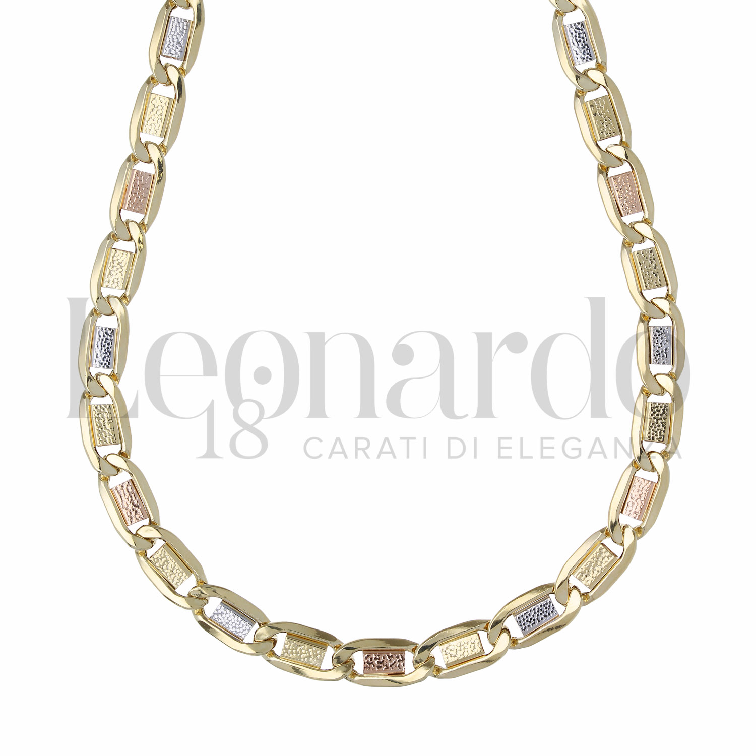 Collana a catena piatta da uomo, maglia Valentino puntinata, filo 120 a 60 cm, in Oro Giallo, Oro Bianco e Oro Rosa.
