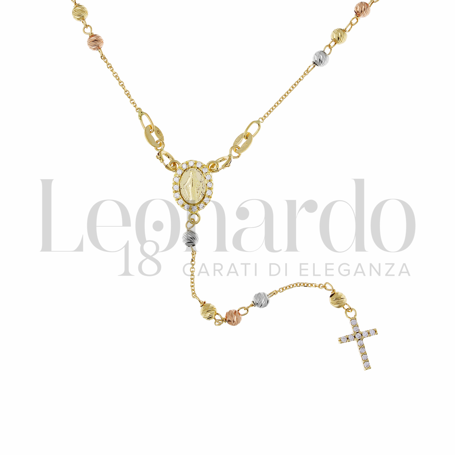 Collana Rosario Ammagliato, Modello Pendente, finitura diamantata slash, con Croce e Miracolosa zirconati, a 5 gruppi di preghiera, con sfere da 3 mm, a 45 cm in Oro Giallo, Oro Bianco e Oro Rosa.