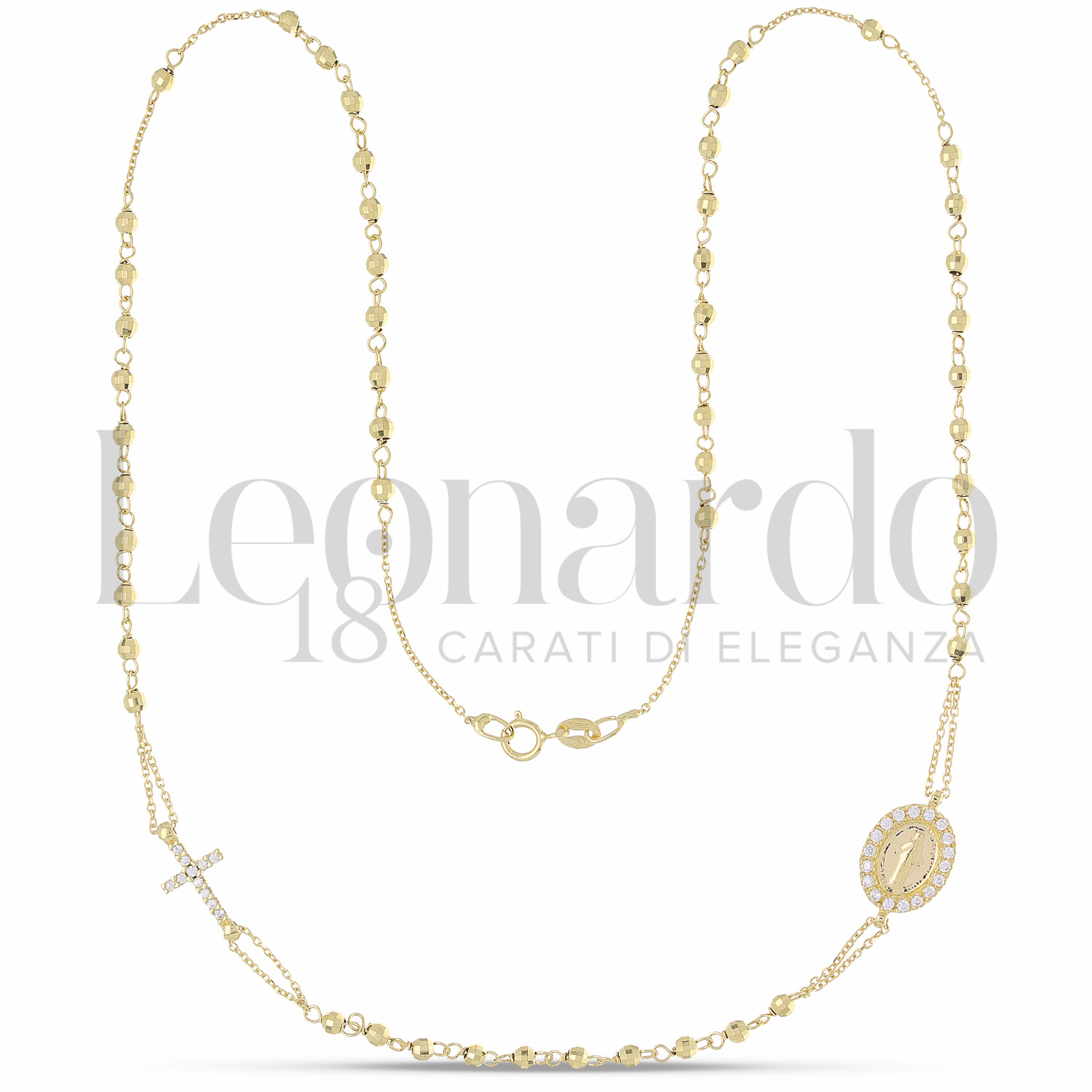 Collana Rosario Girocollo ammagliato, con sfere da 2,50 mm, finitura sfaccettata, a 5 gruppi di preghiera, con Miracolosa e Croce Zirconata a 45 cm in Oro Giallo.