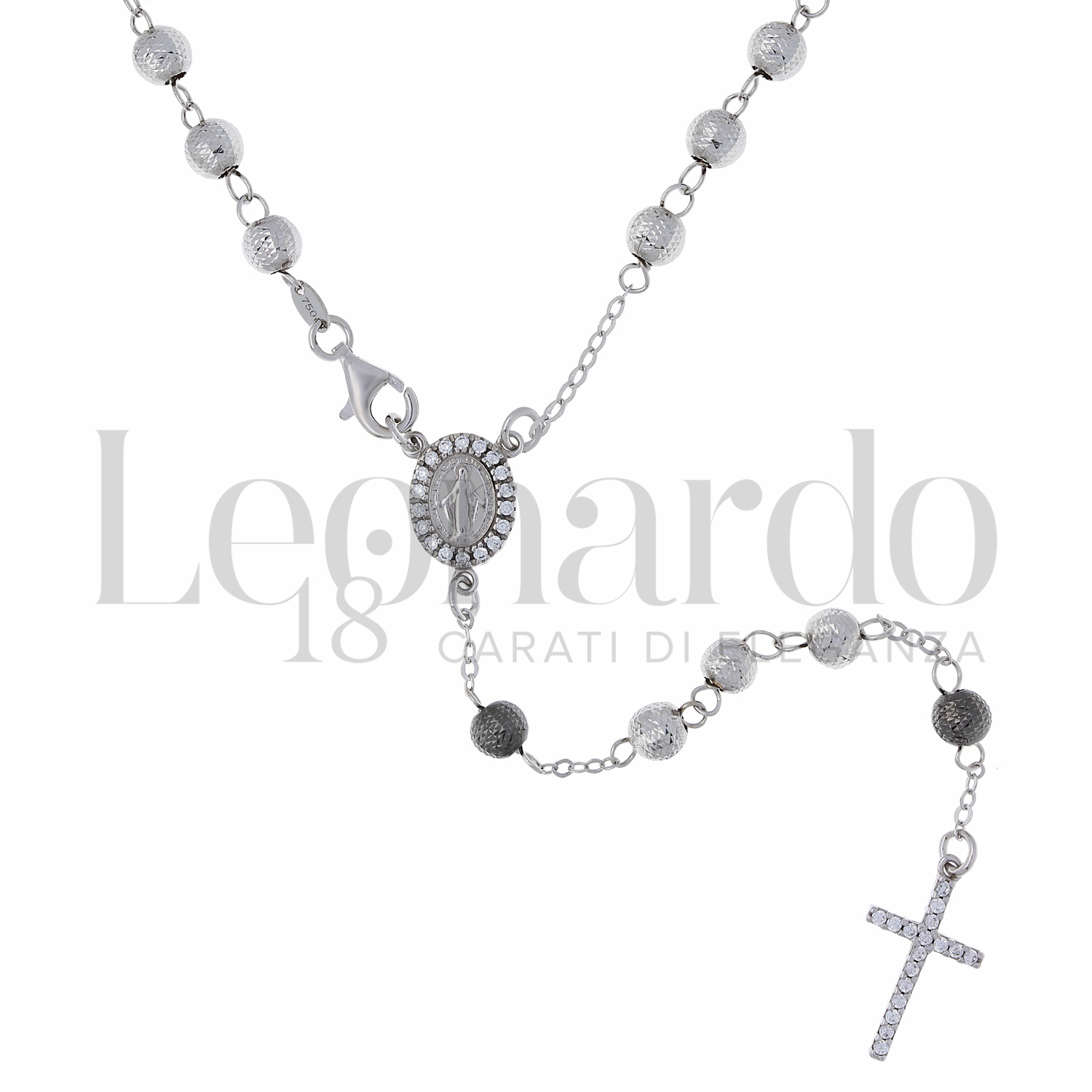 Collana Rosario Ammagliato, Modello Pendente, finitura diamantata slash, con Croce e Miracolosa zirconati, a 5 gruppi di preghiera, con sfere da 3 mm, a 60 cm in Oro Giallo e Oro Bianco
