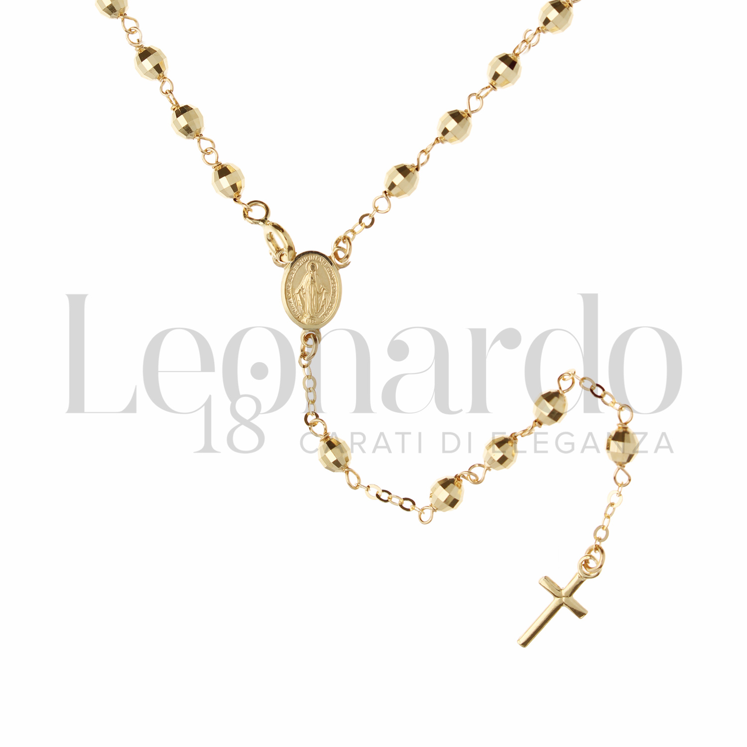 Collana Rosario Girocollo ammagliato, con sfere da 2,50 mm, finitura sfaccettata, a 5 gruppi di preghiera, con Miracolosa e Croce Zirconata a 50 cm in Oro Giallo