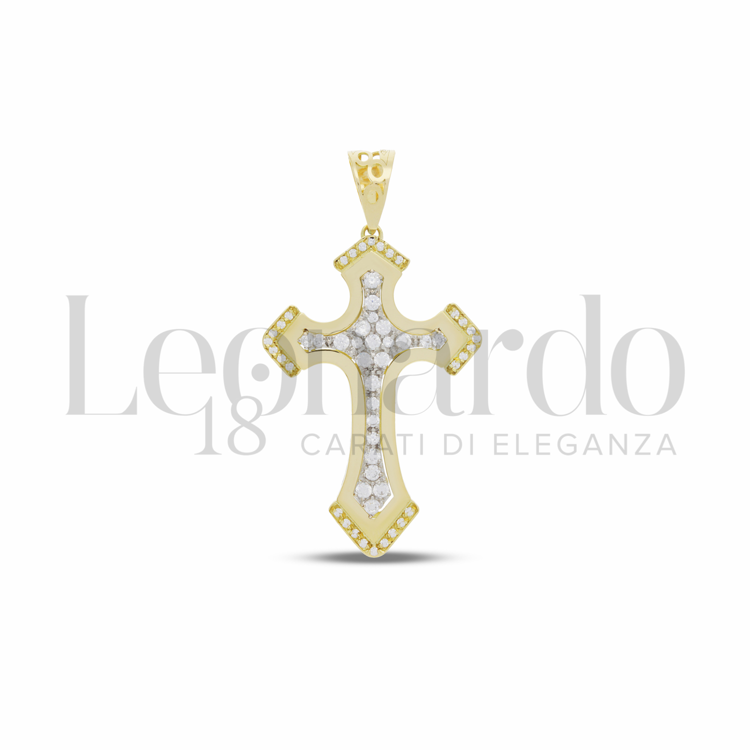 Croce da Uomo, 2° Misura, con pavè di zirconi bianchi, in Oro Giallo e Oro Bianco.