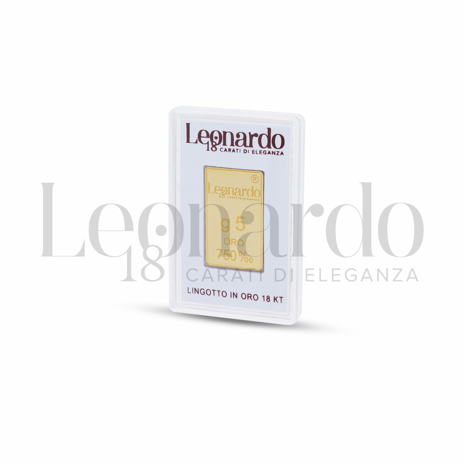 Lingotto da 5 gr, con stampo frontale, blisterato, finitura lucida in Oro Giallo.