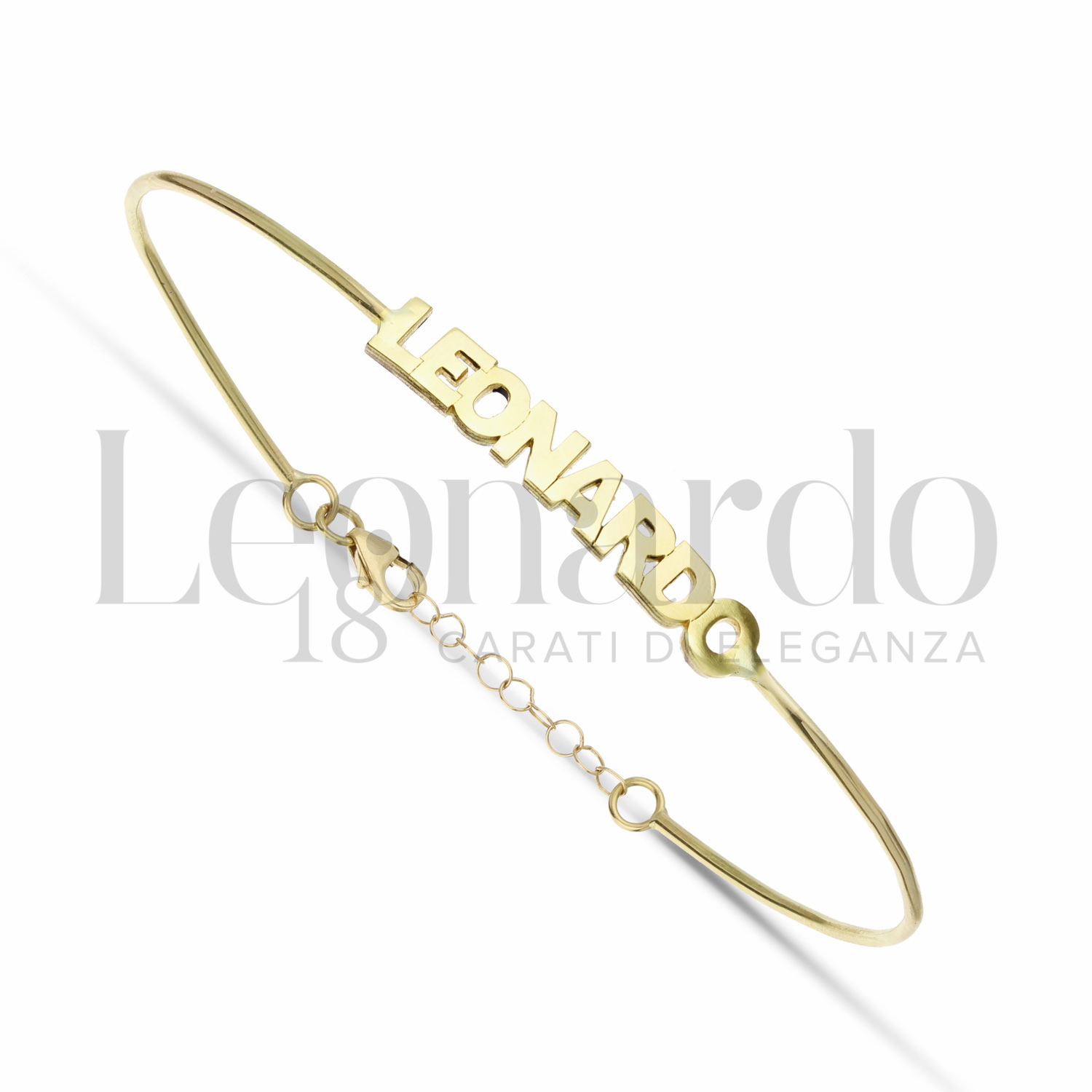 Bracciale rigido con nome in stampatello, con lastra da 1 mm, diametro interno 50 mm, in Oro Giallo.