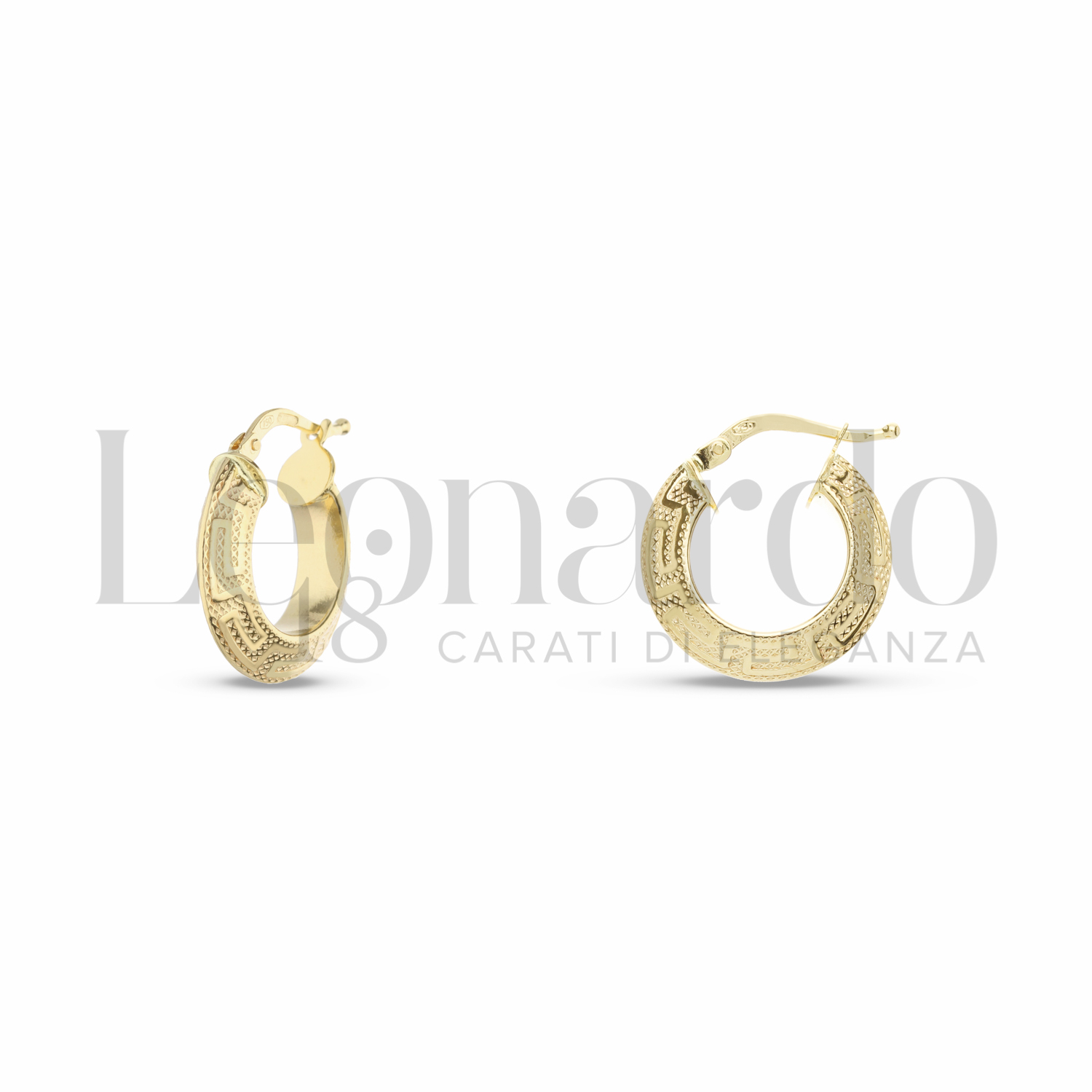 Orecchini a cerchio a mezza canna, con greca, diametro 10 mm, in Oro Giallo.