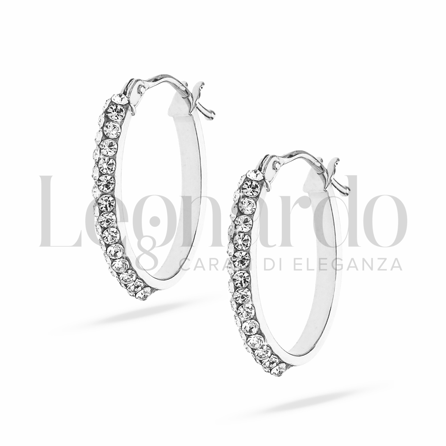 Orecchini a cerchio ovale da Donna, diametro interno 10 mm, canna tonda da 2,00 mm, con swarovski bianchi, finitura lucida, chiusura a baionetta, in Oro Bianco.
