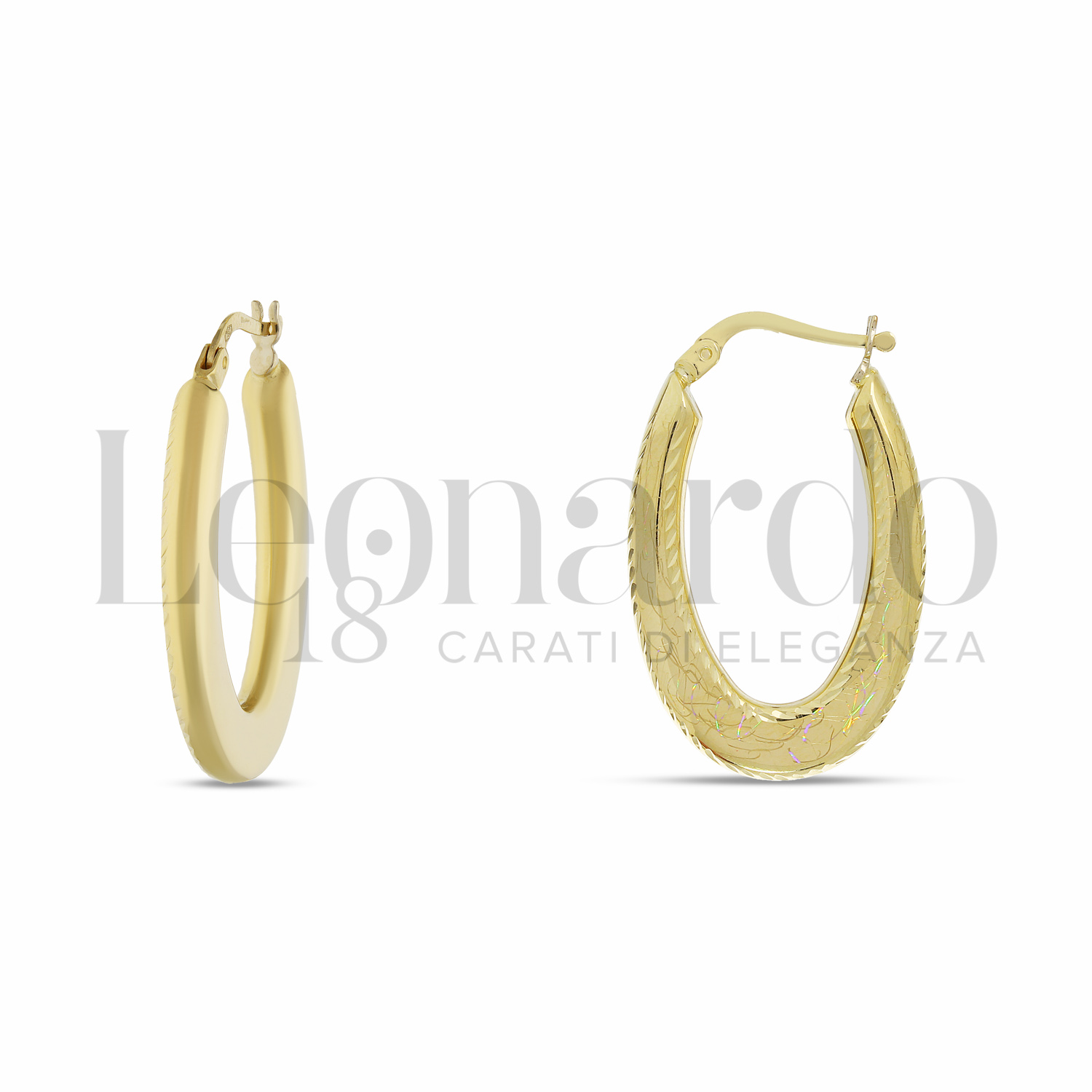 Orecchini a Cerchio da Donna, di forma Ovale, finitura diamantata olografica, in Oro Giallo.