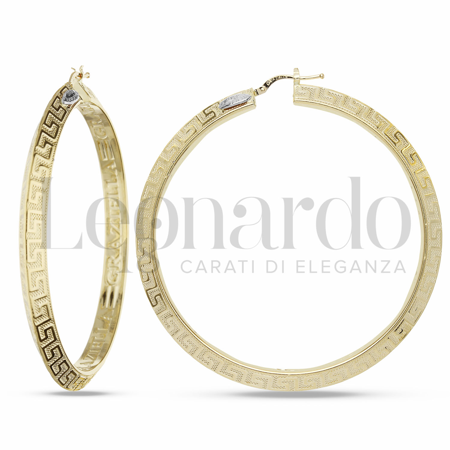 Orecchini a cerchio da Donna con greca incisa, diametro interno 55 mm, canna da 6,00 mm, finitura lucida e satinata, chiusura a baionetta, in Oro Giallo.