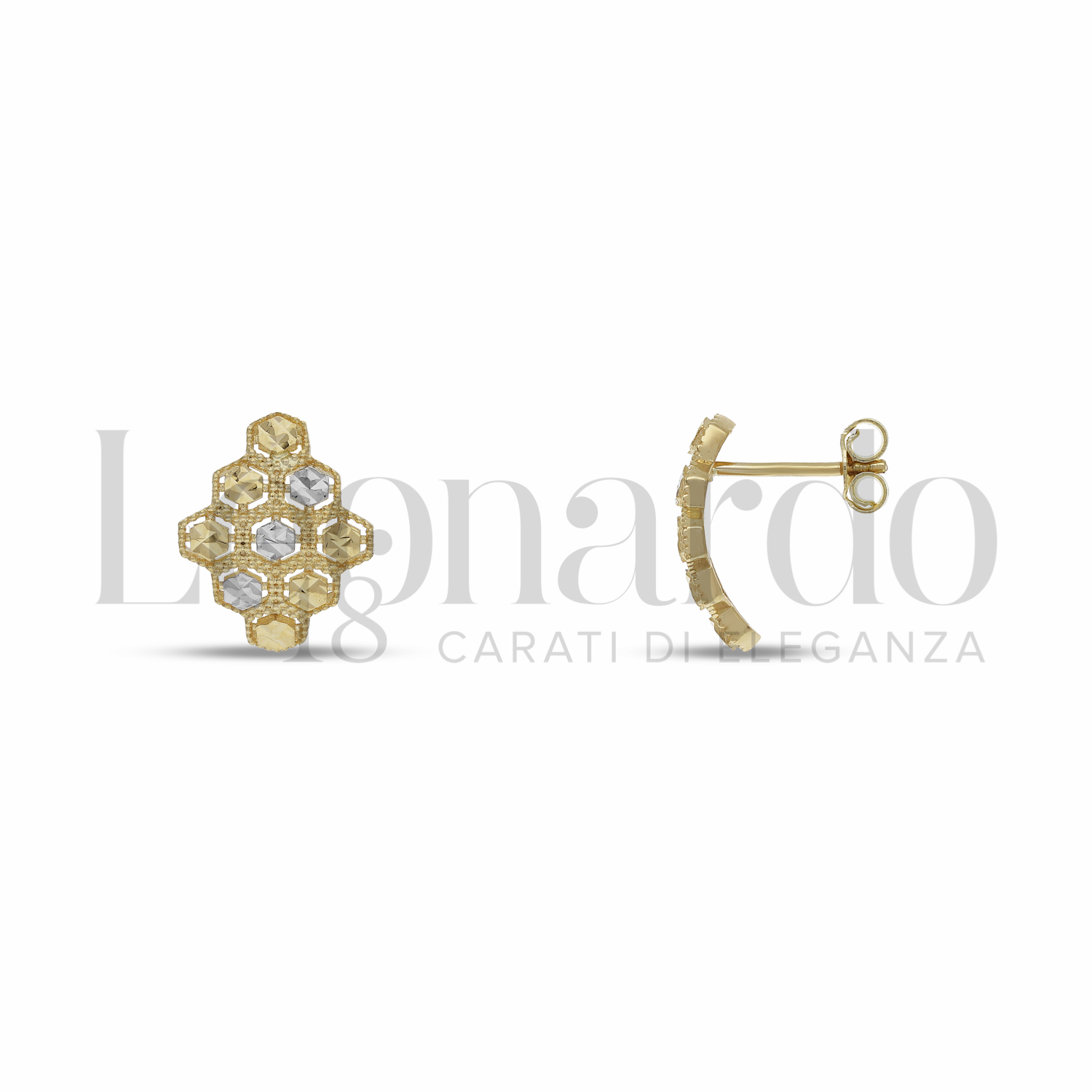 Orecchini a Lobo da Donna, Aura Collection, con lastre diamantate e contorno godronato, chiusura perno e vite, in Oro Giallo e Oro Bianco.