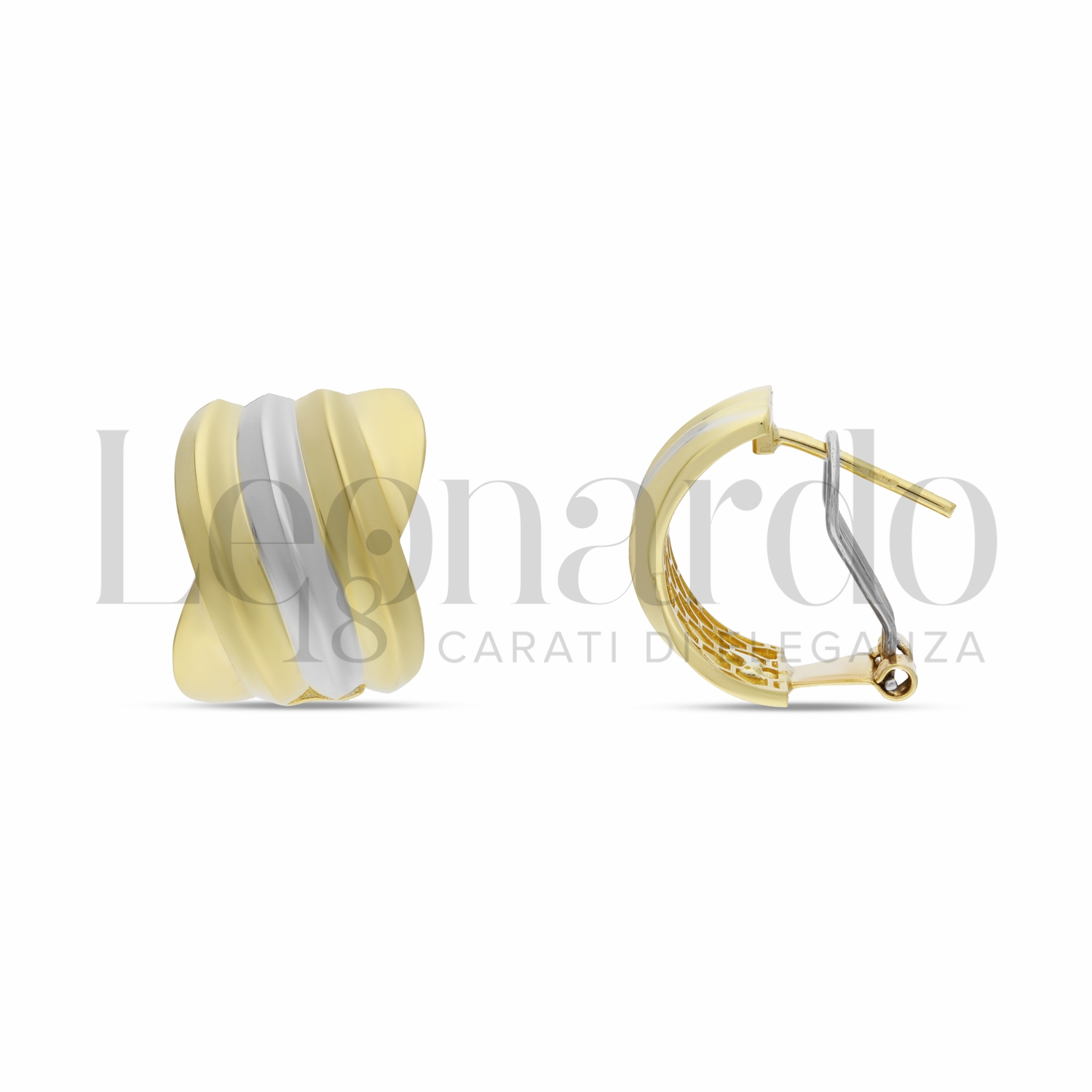 Orecchini a Lobo da Donna, realizzati con Lavorazione 3D, finitura lucida, chiusura Clips e Peno in Oro Giallo e Oro Bianco.