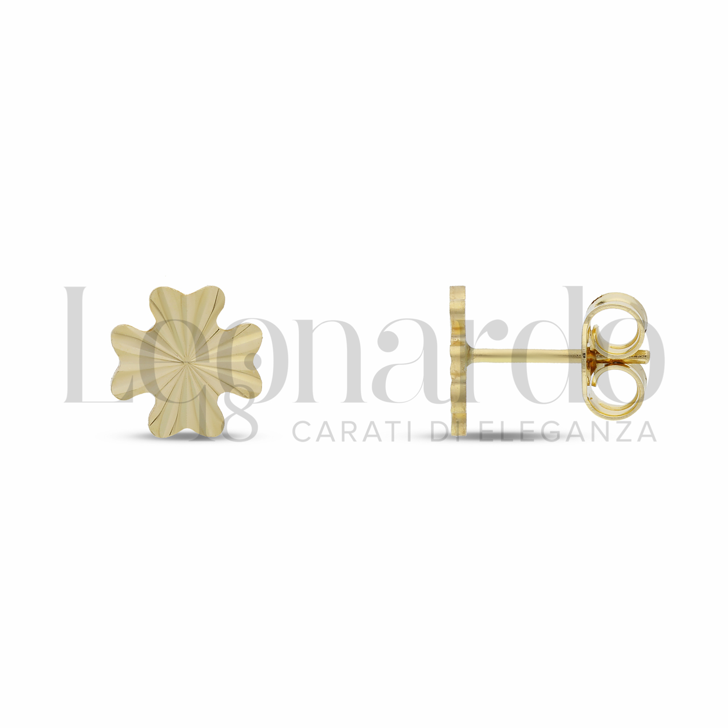 Orecchini a Lobo da Donna, a Forma di Quadrifoglio, 1° misura, chiusura perno e vite, finitura diamantata in Oro Giallo.