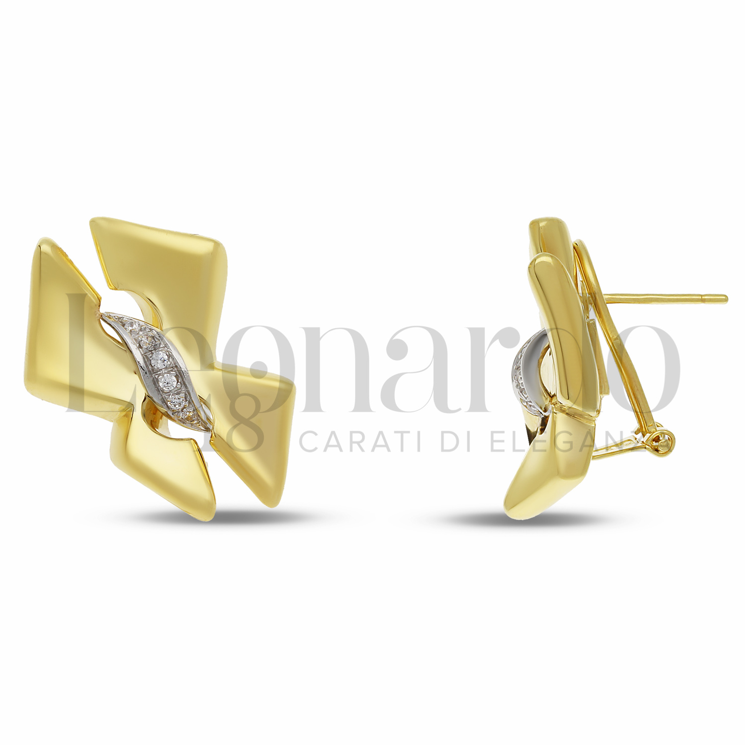 Orecchini a Lobo Elettroformati da Donna, Fiocco, May Collection, con Zirconi Bianchi, finitura lucida, chiusura Clip e Perno, in Oro Giallo e Oro Bianco.