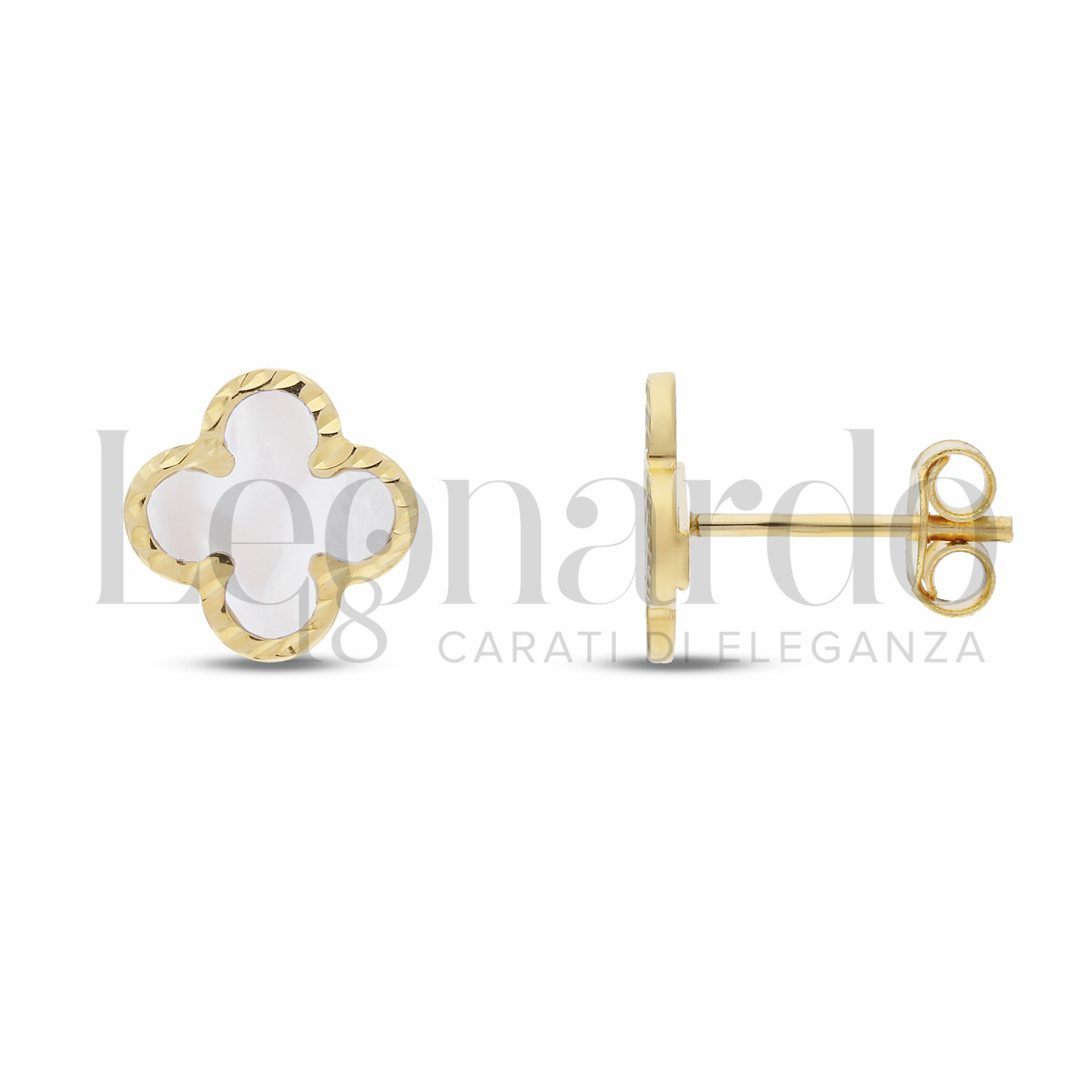 Orecchini a Lobo da Donna, Quadrifoglio, con Madreperla, 2° Misura, finitura diamantate in Oro Giallo.
