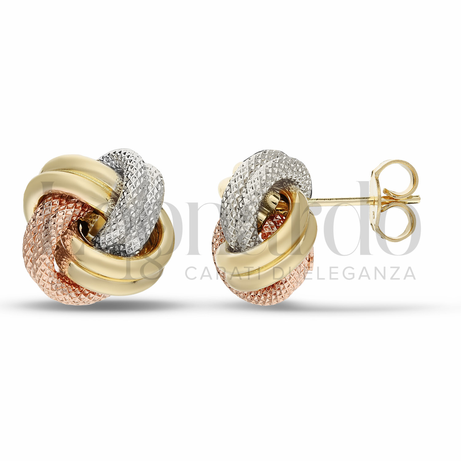 Orecchini a Lobo da Donna, nodo, 2° misura, chiusura perno e vite, finitura lucida e godronata in Oro Giallo, Oro Bianco e Oro Rosa.
