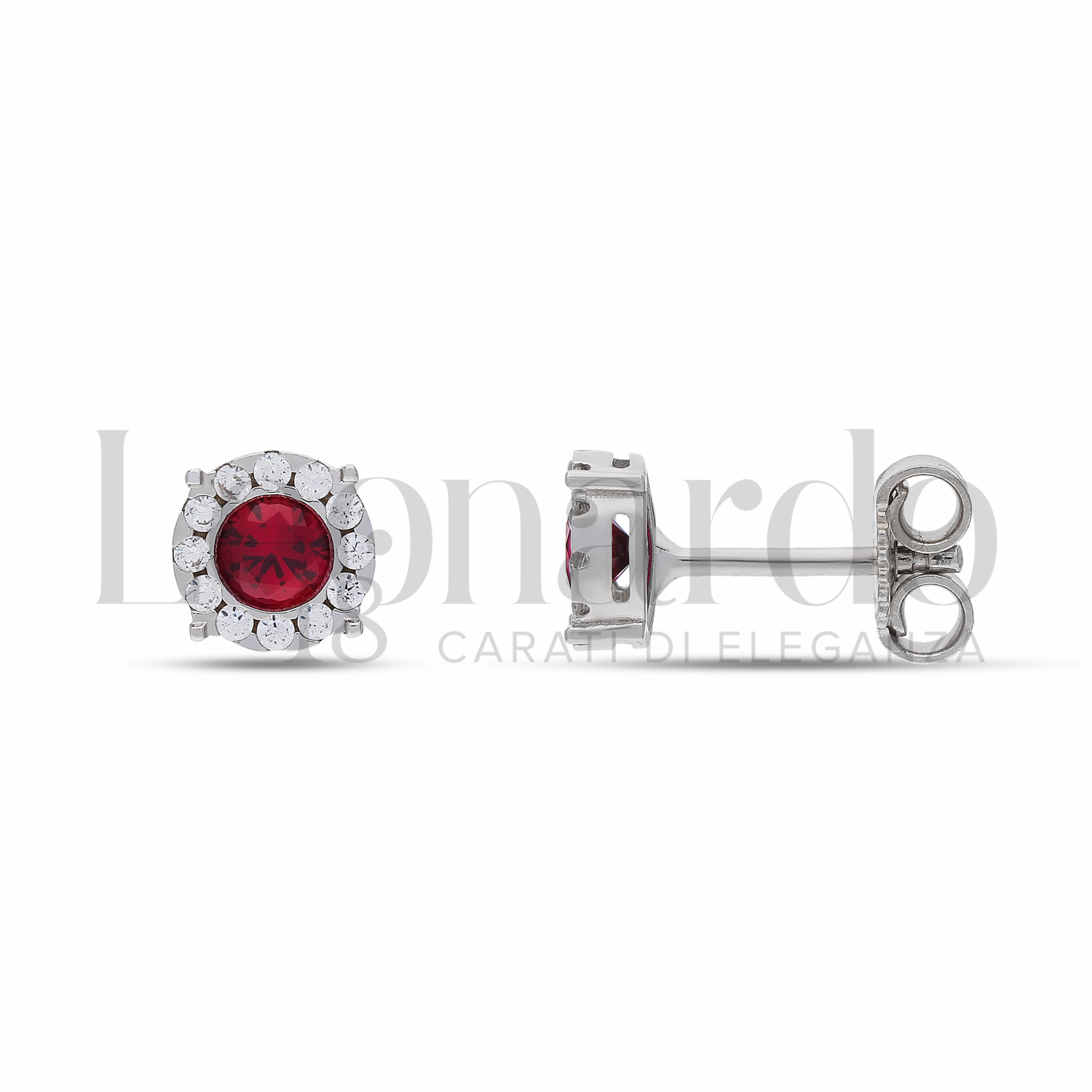 Orecchini a Lobo da Donna, con Pietra Tonda Rossa, contornata da una fila di zirconi Bianchi, chiusura perno e vite in Oro Bianco.