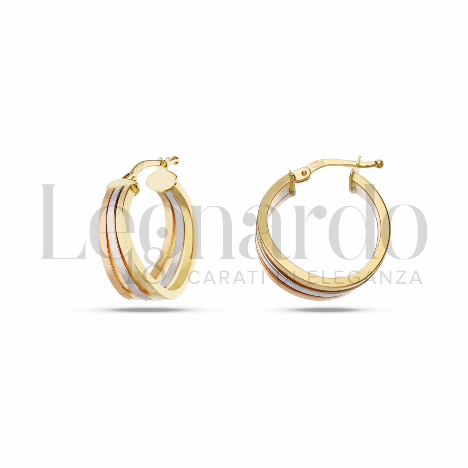 Orecchini a cerchio da donna, chiusura a baionetta, modello curvo, diametro interno 15 mm, in Oro Giallo, Bianco e Rosa.