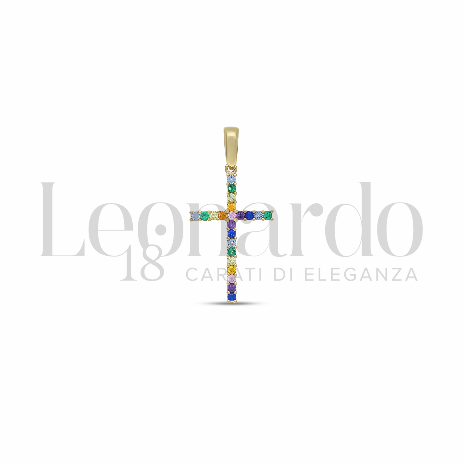 Croce da Donna, 3 ° misura, con Pietre Rainbow in Oro Giallo.