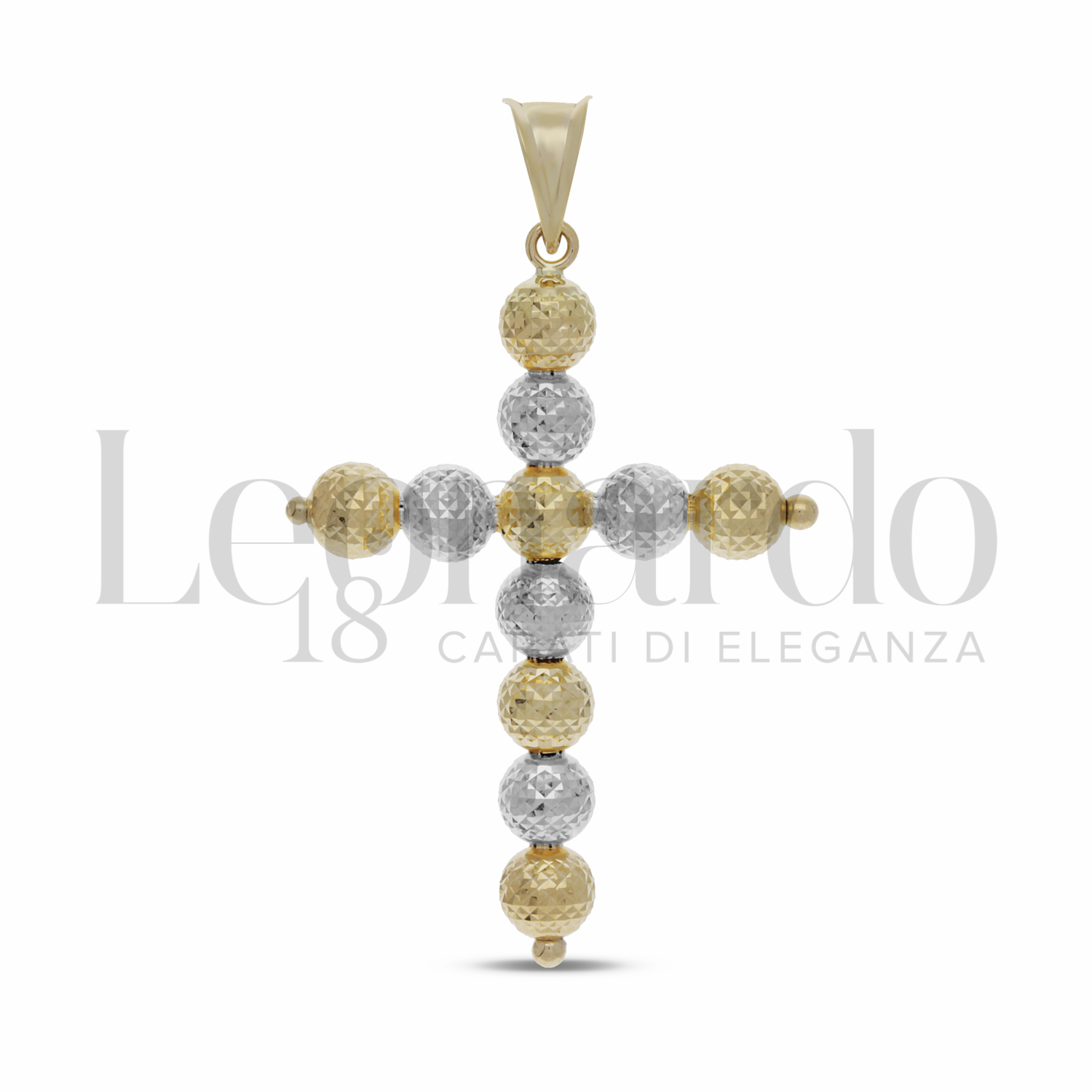 Pendente Croce Pallinata Light, sfera da 6,00 mm, 2° Misura, finitura diamantata Mille Facce, In Oro Giallo e Oro Bianco.