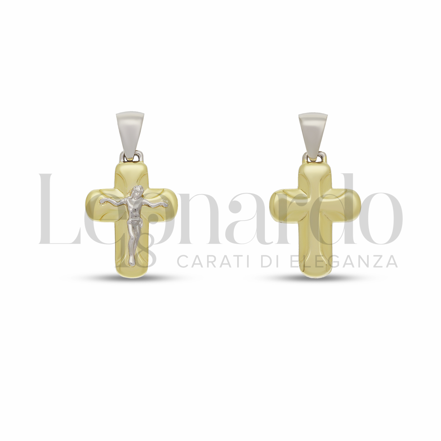 Croce da Uomo scatolata, con Cristo, 1° misura, finitura Lucida in Oro Giallo e Oro Bianco.
