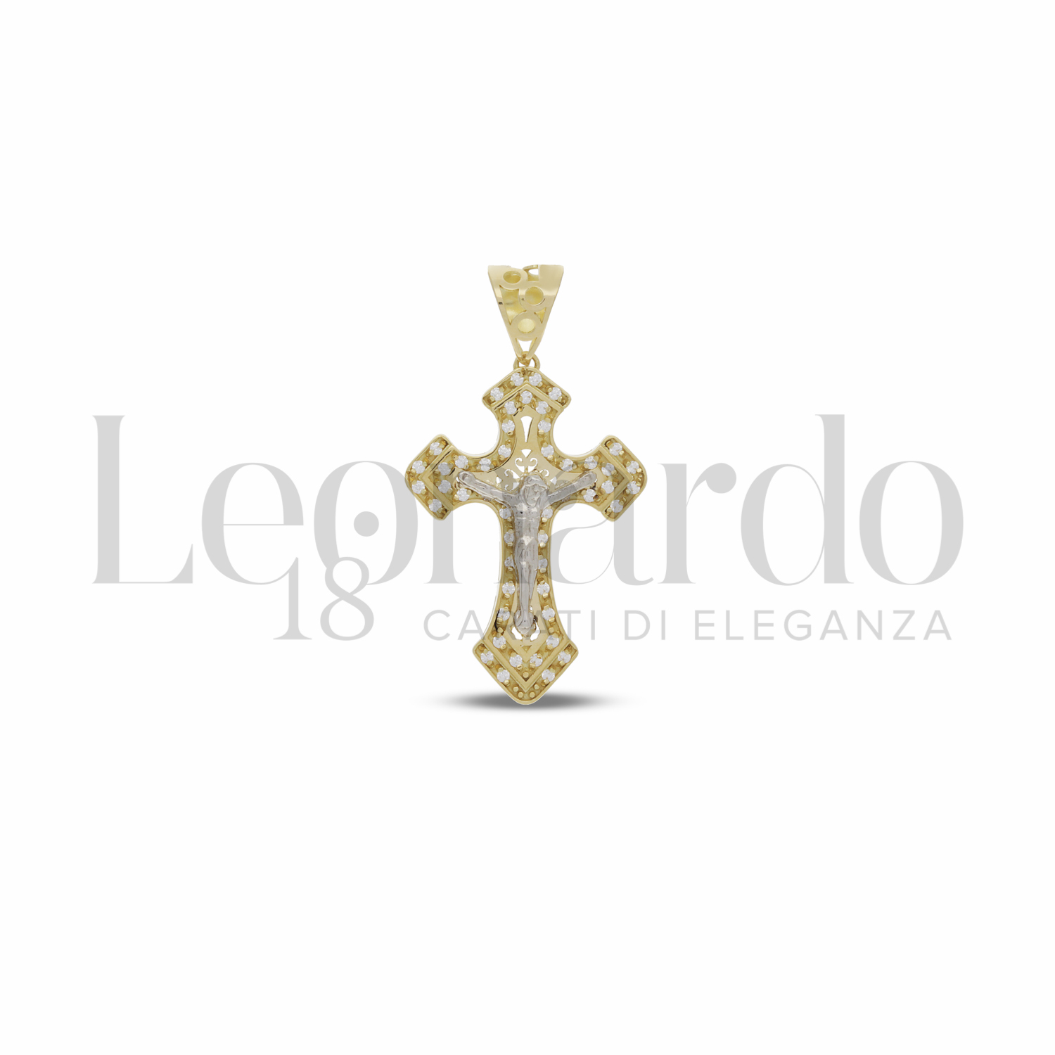 Croce con Cristo e zirconi bianchi, 1° Misura, in Oro Giallo e Oro Bianco.