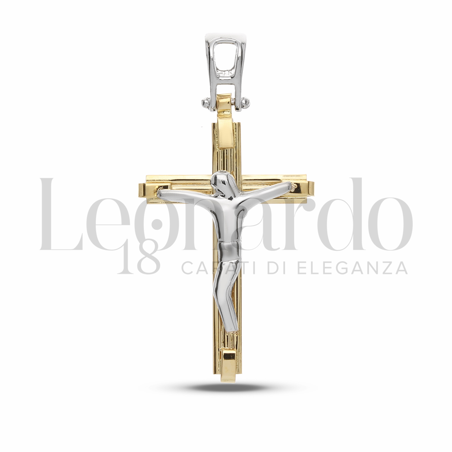 Croce scatolata, con Cristo stilizzato, 1° Misura, in Oro Giallo e Oro Bianco.