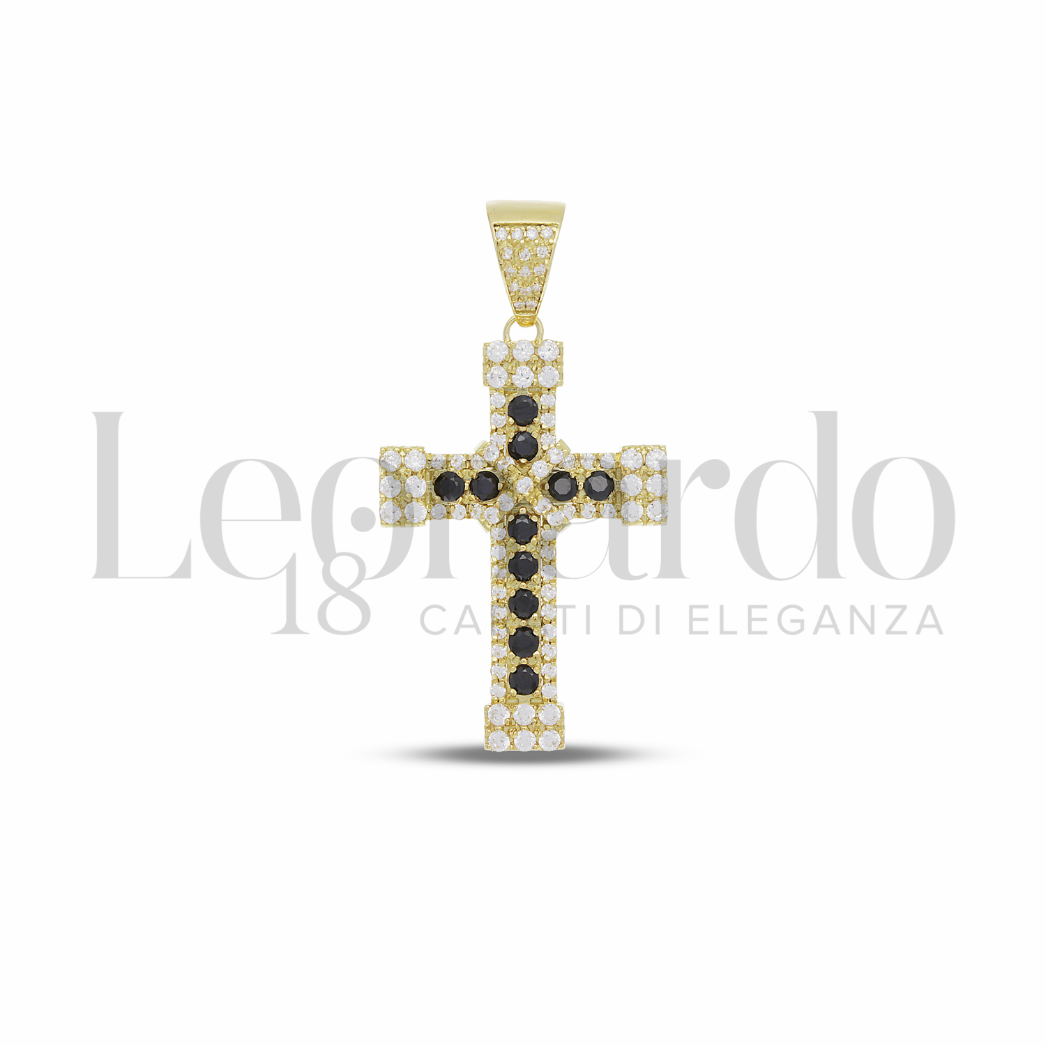 Croce da Uomo, Con Pavè di Zirconi Bianchi e Zirconi Neri, senza Cristo, 2° misura, finitura Lucida in Oro Giallo.