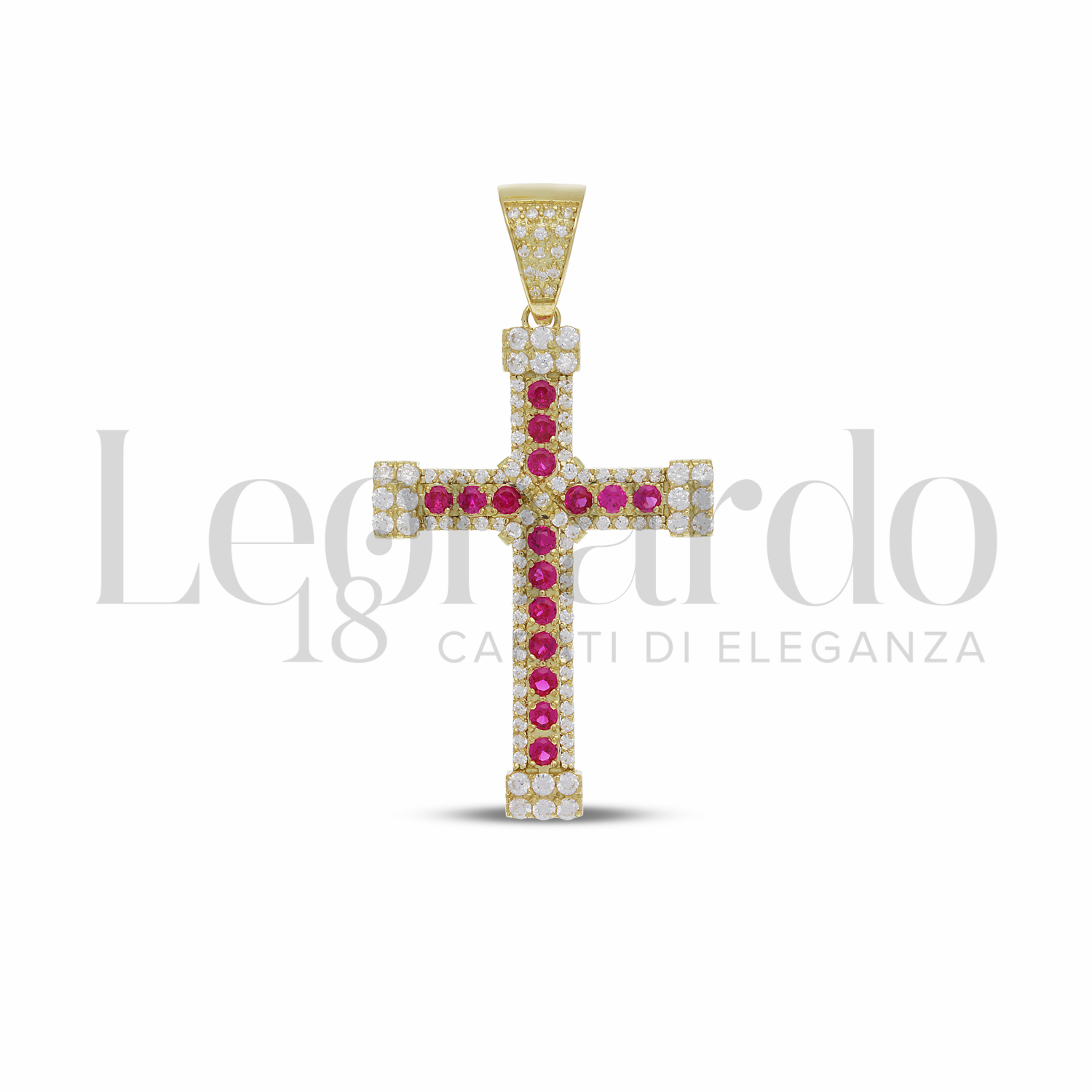 Croce da Uomo, Con Pavè di Zirconi Bianchi e Zirconi Rossi, senza Cristo, 3° misura, finitura Lucida in Oro Giallo.