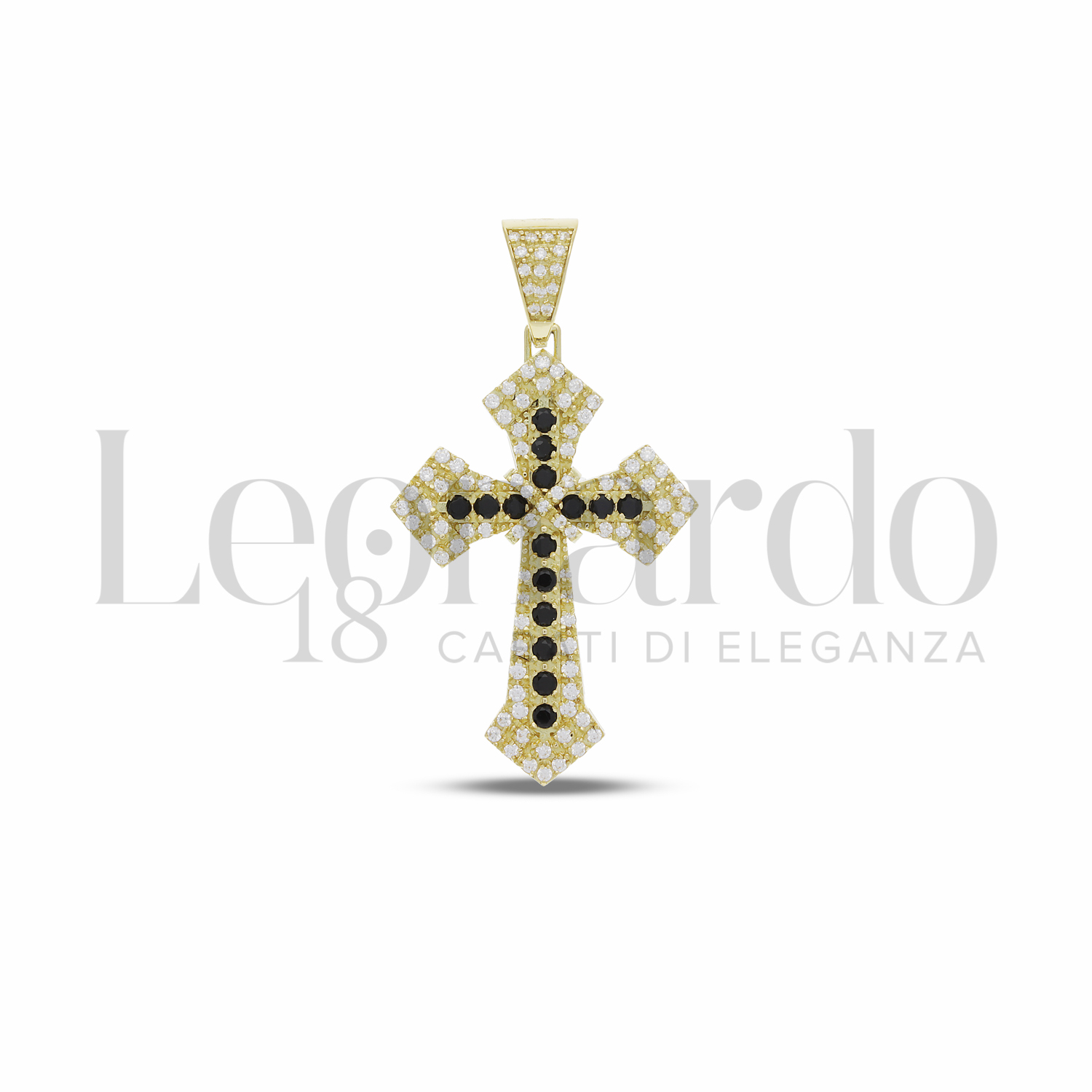 Croce da Uomo, con Pavè di Zirconi Bianchi e Zirconi Neri, 2 ° misura, finitura Lucida, in Oro Giallo.