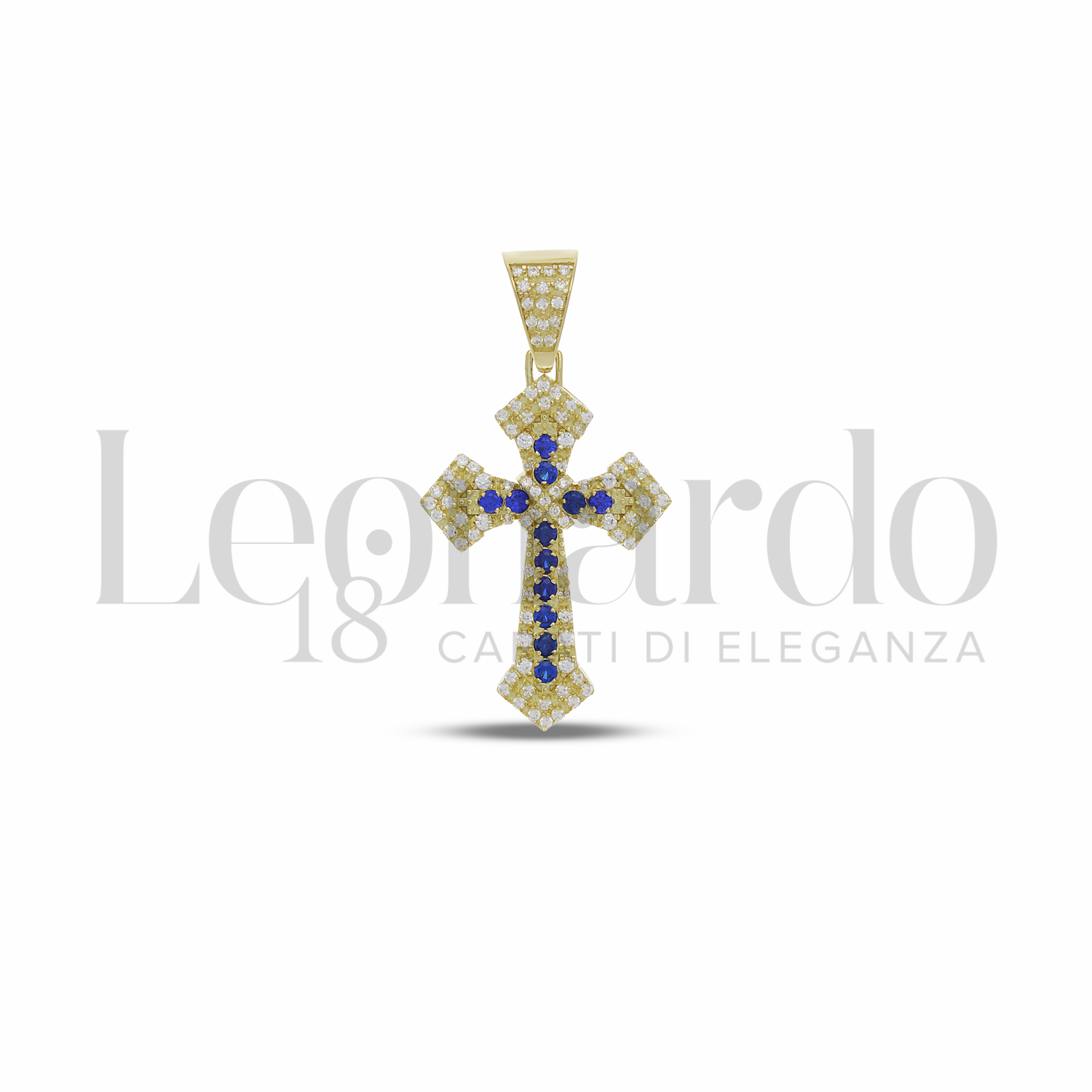 Croce da Uomo, con Pavè di Zirconi Bianchi e Zirconi Blu, 1 ° misura, finitura Lucida, in Oro Giallo.