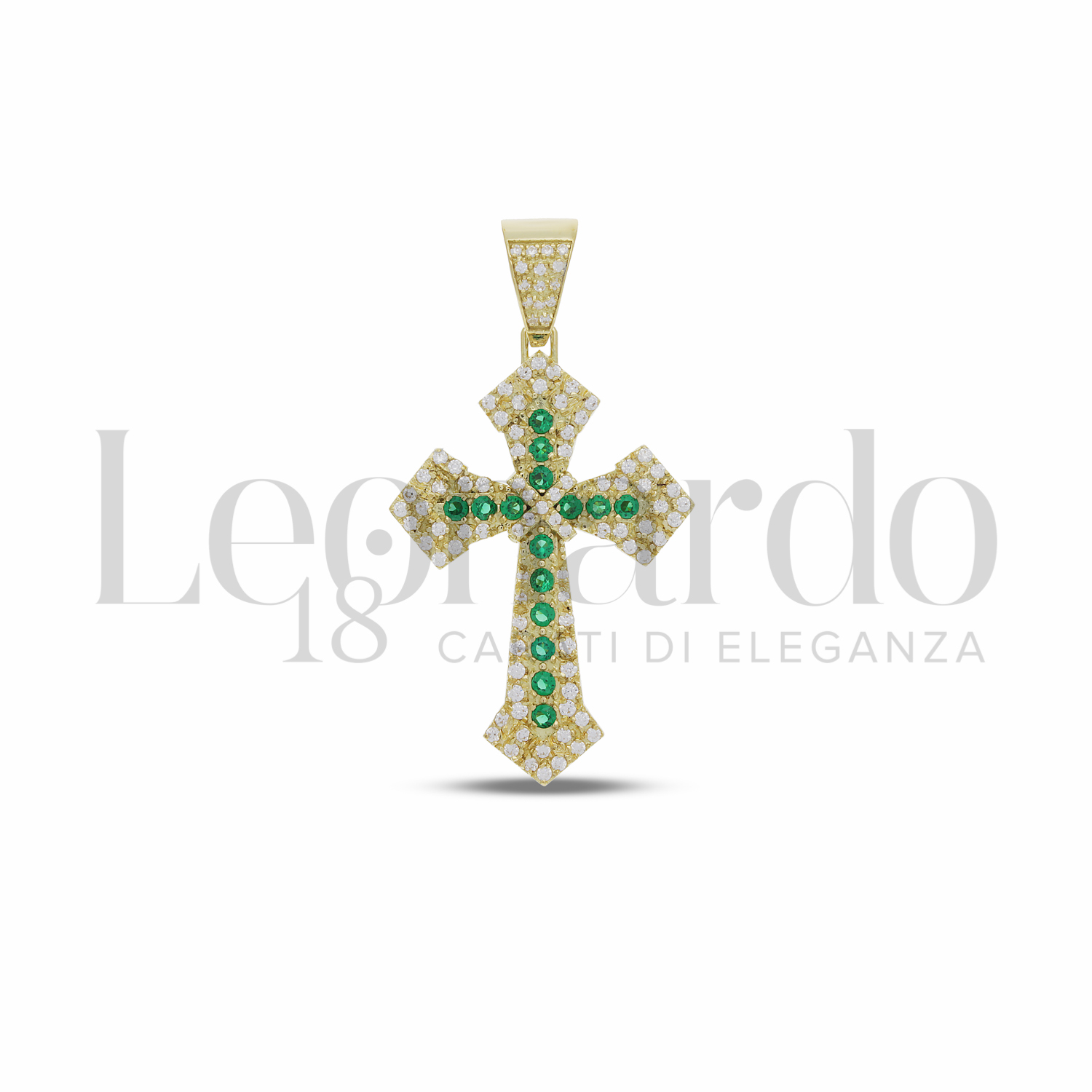Croce da Uomo, con Pavè di Zirconi Bianchi e Zirconi Verdi, 2 ° misura, finitura Lucida, in Oro Giallo.